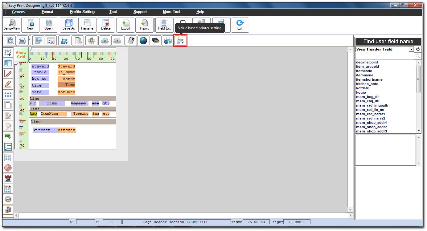 - In the Easy Print Designer screen, click Value based printer setting icon to display field value based printer setting.