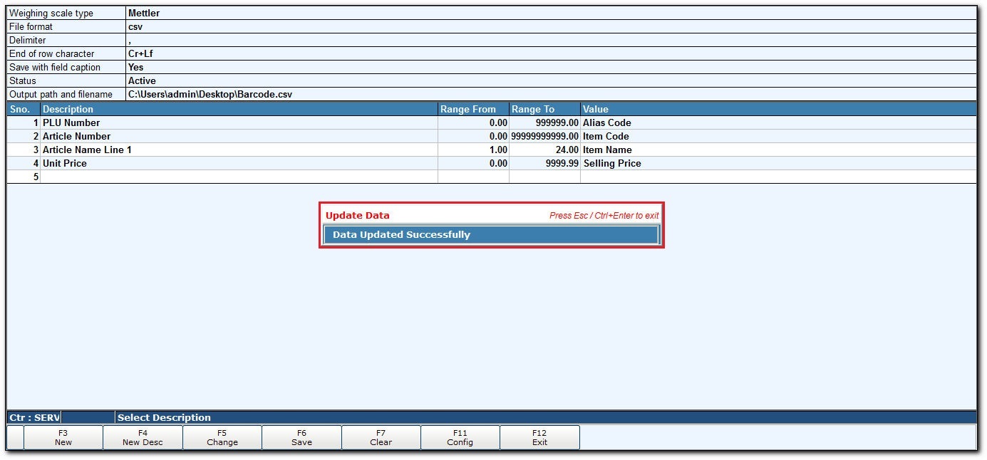 - A message Data Updated Successfully is displayed. Press ESC or CTRL + ENTER to close the screen.