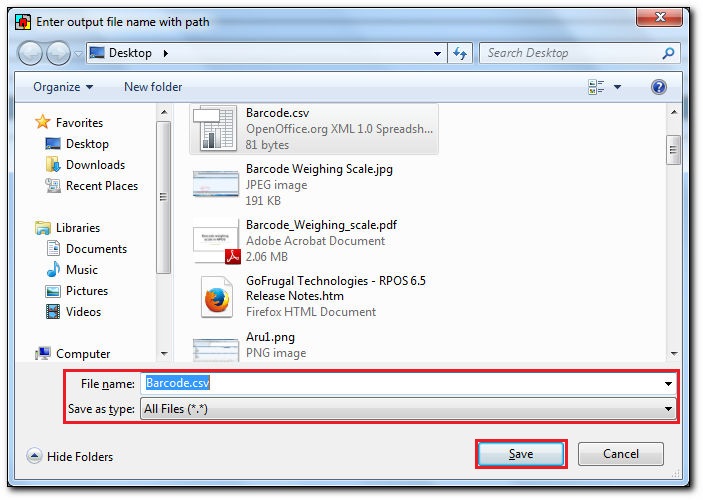 - In the File name field, enter the file name. For example - Barcode.csv