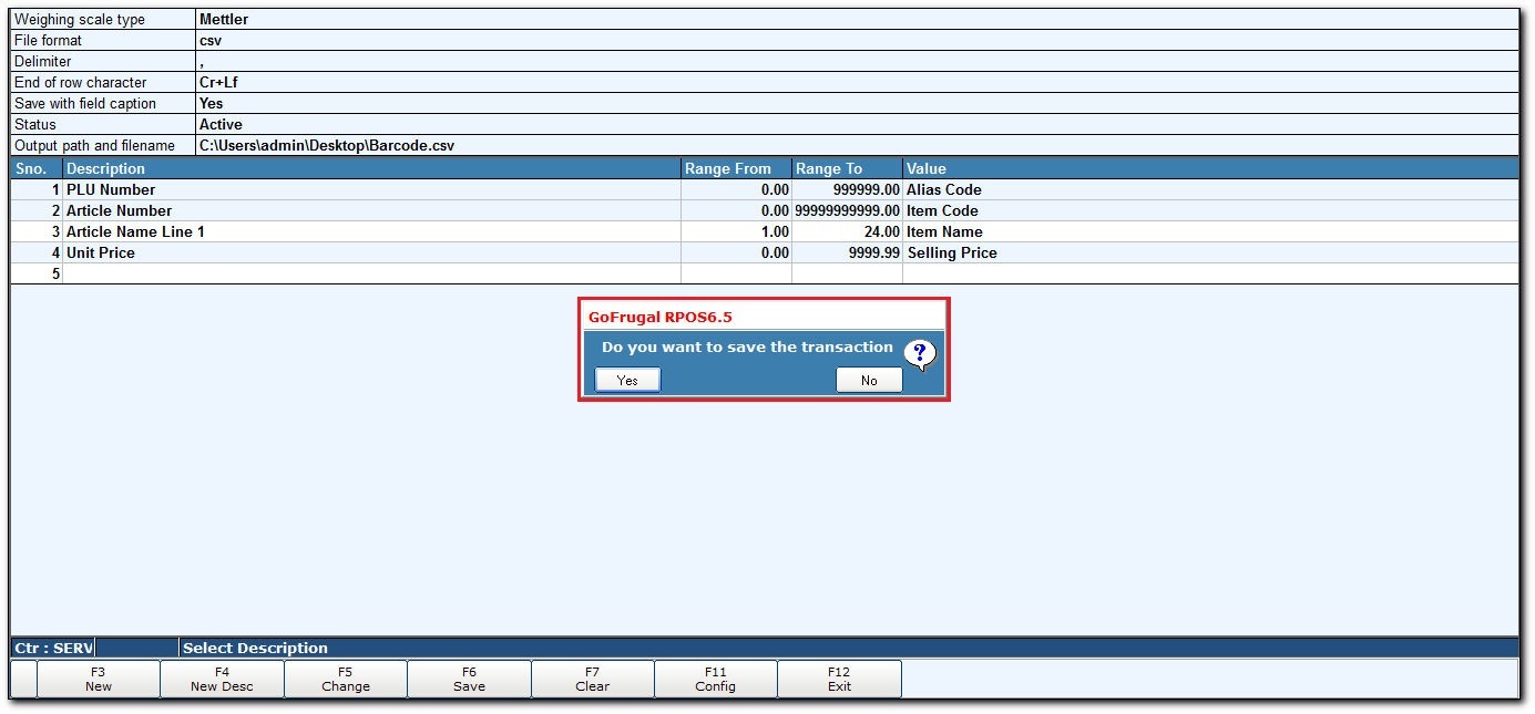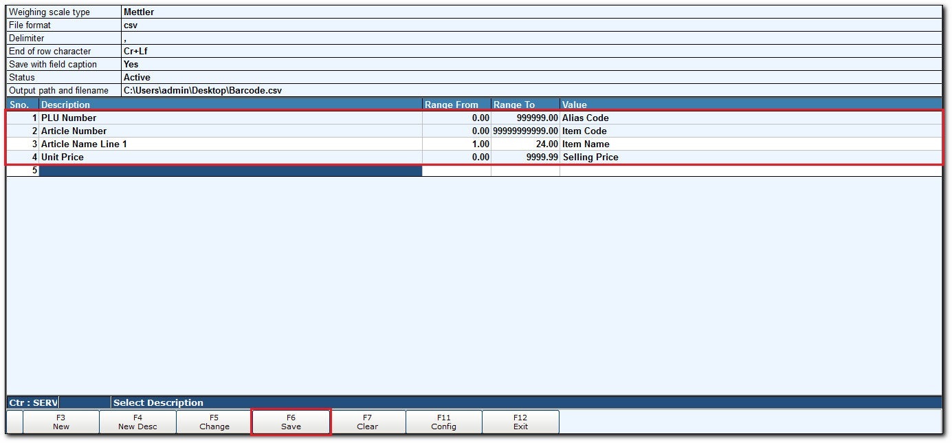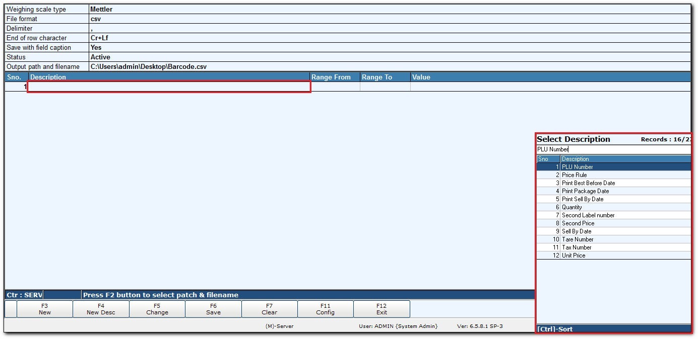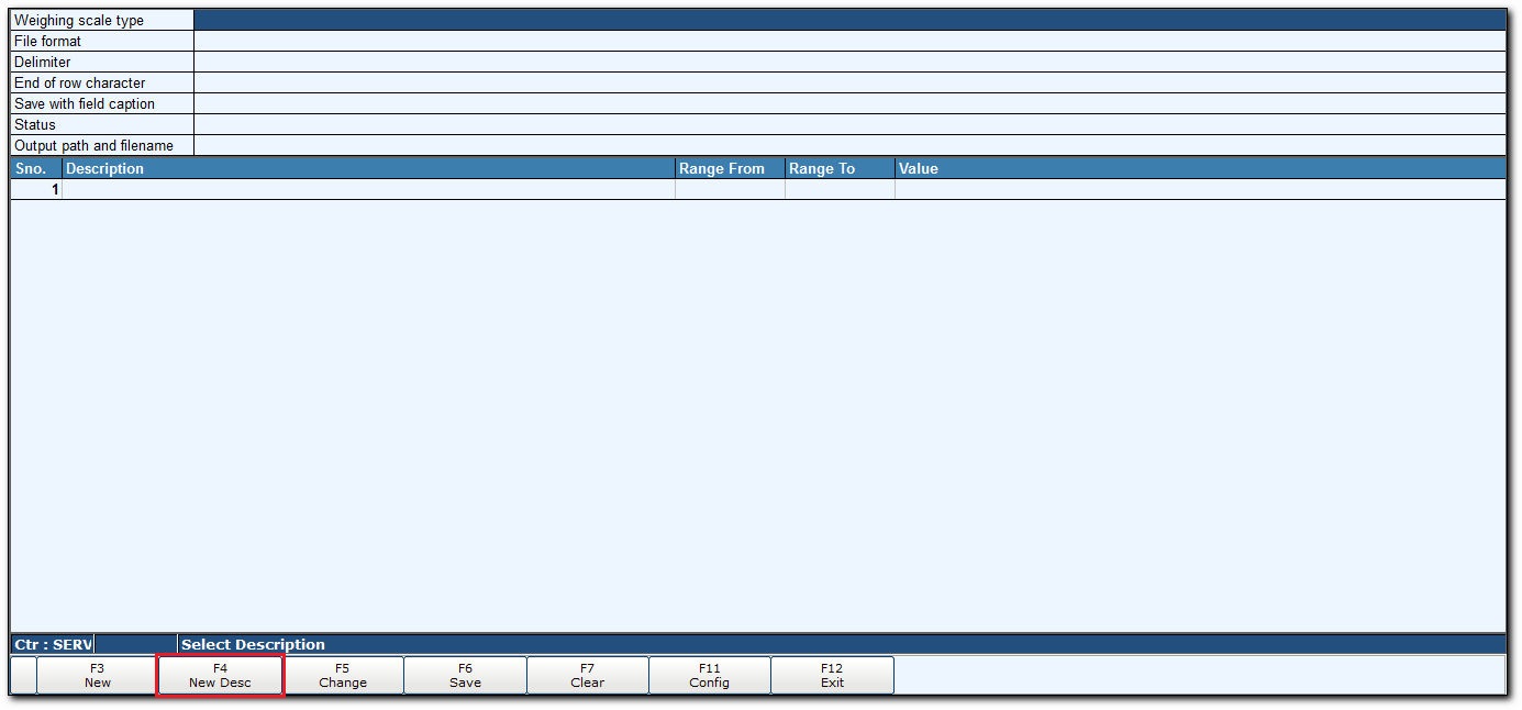 - In the Weighing scale - Configuration screen, click New Desc or press F4 to display Data Transfer Descriptiion screen.