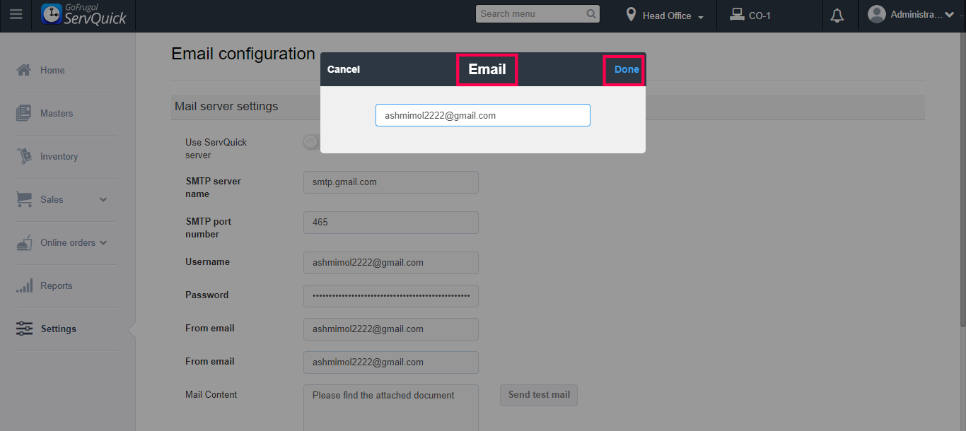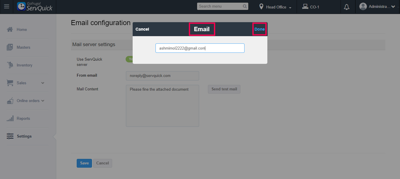 Step4: Enter the recipient mail id in the pop-up box displayed and click on Done. After clicking on done, the test mail will be sent to the entered email id.