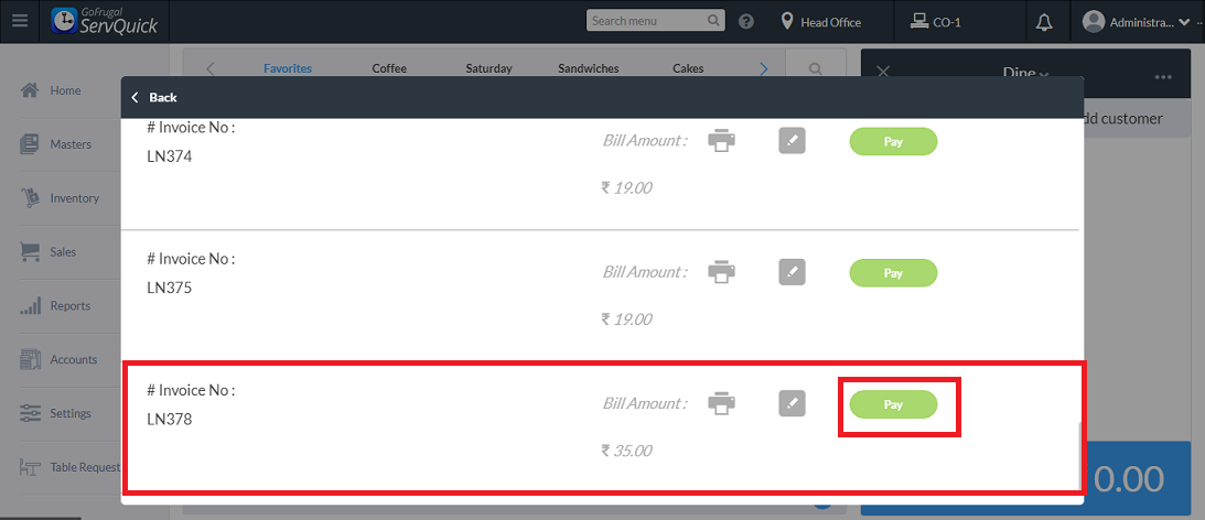 Click on the bill, and the invoice due for payment is displayed on the screen. Select the respective invoice and click on Pay.