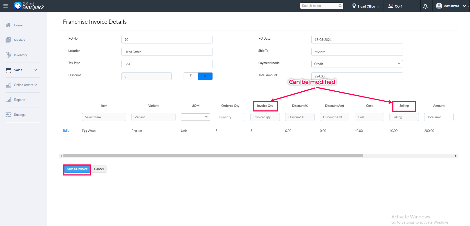 Note: You can modify the Invoice Quantity and Selling Price of an item