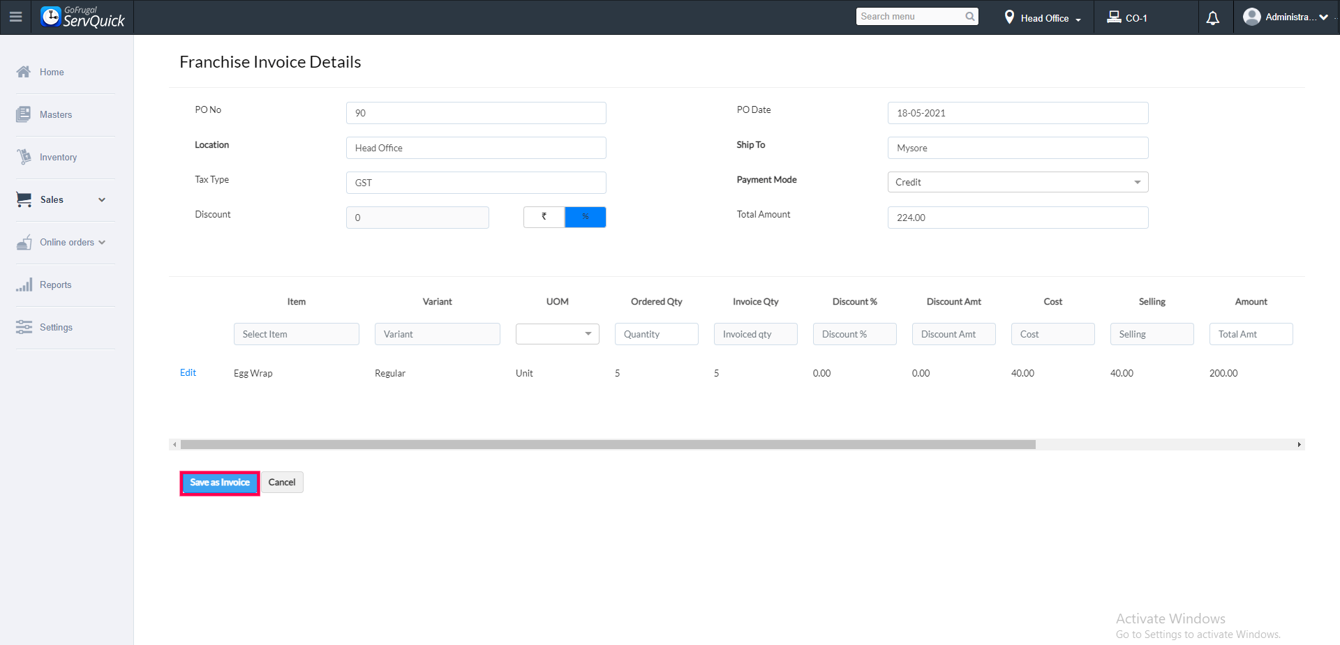 Step4: Click on Save as Invoice to convert the Sales Order to Sales Invoice