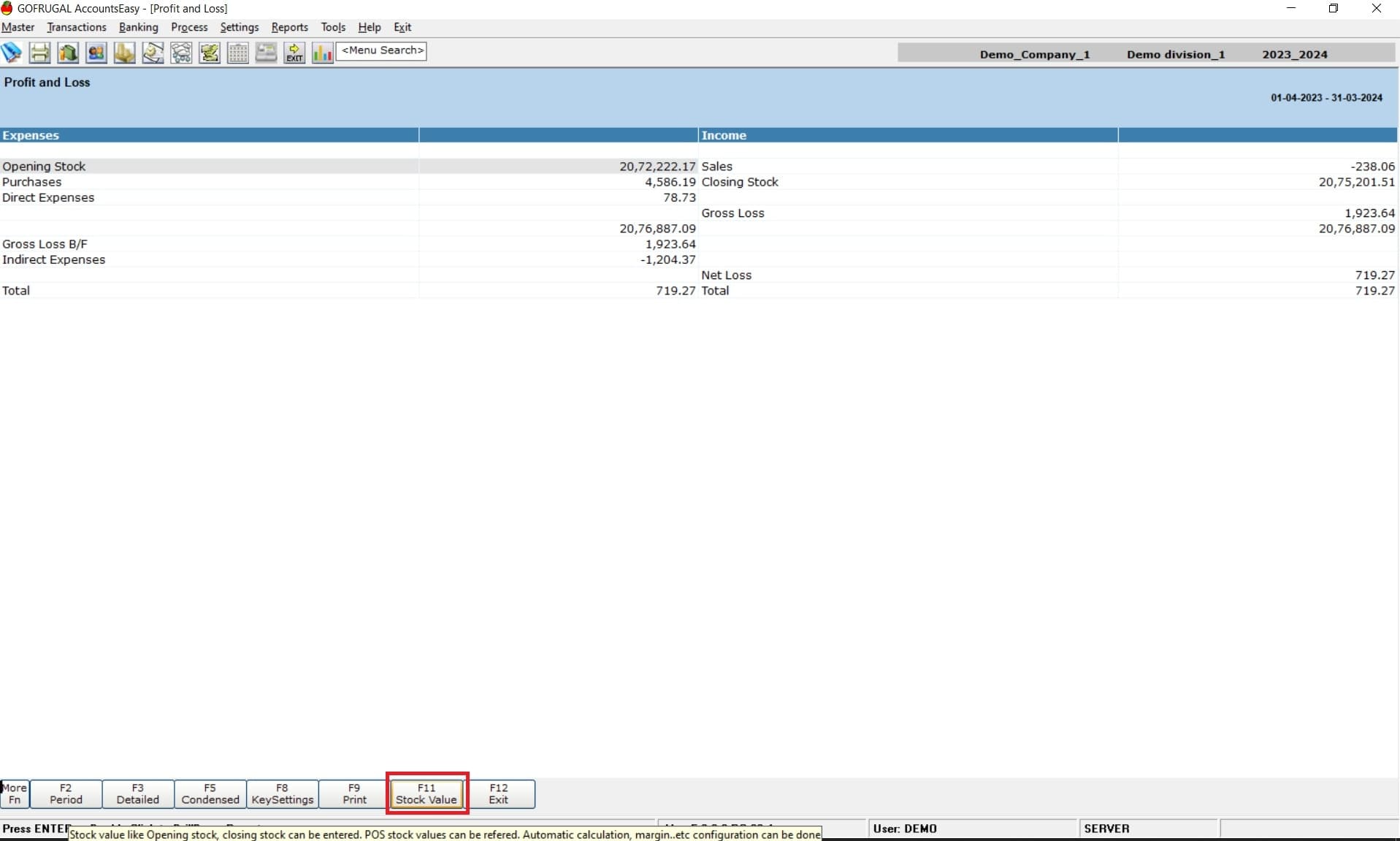 Locate and click on the stock value button [F11] in the profit and loss report.