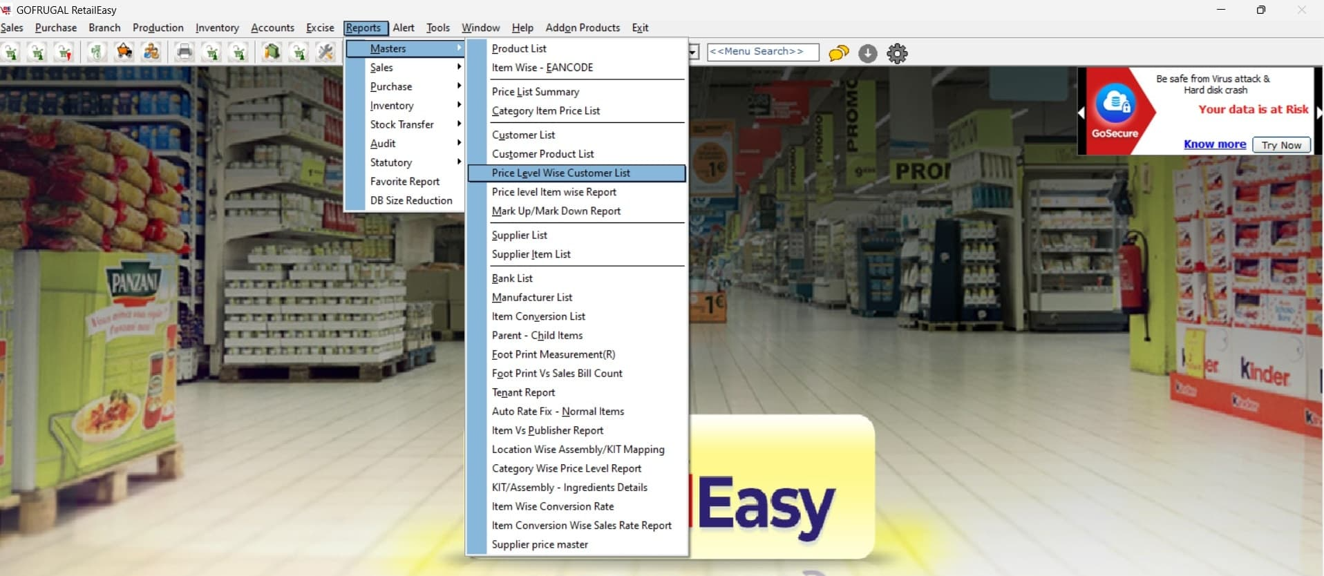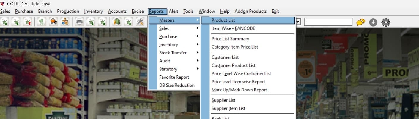 Answer: Navigate to Reports, then select "Master" followed by "Product List Report" to access the complete list of products.