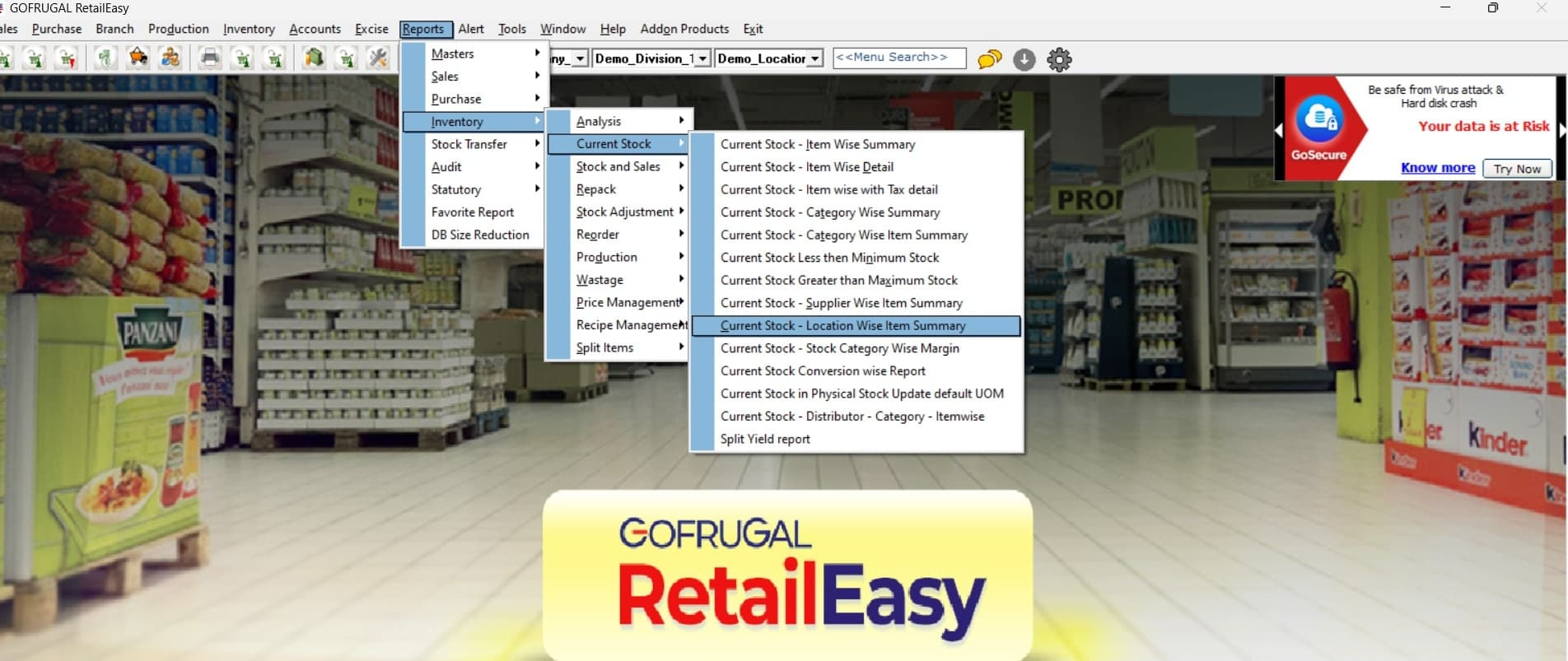 Answer: Go to the Reports section, select Inventory ->Current stock, and choose "Location-wise Stock Summary" to view the current stock available at each location.