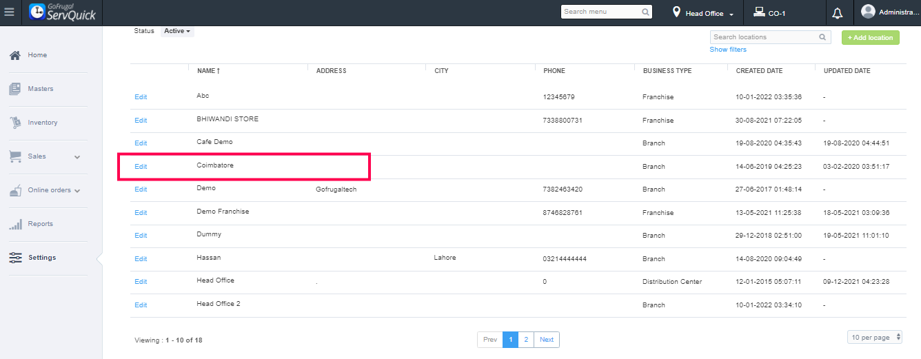 Select the location for which you want to enable the KOT Consolidated Print and click on Edit.