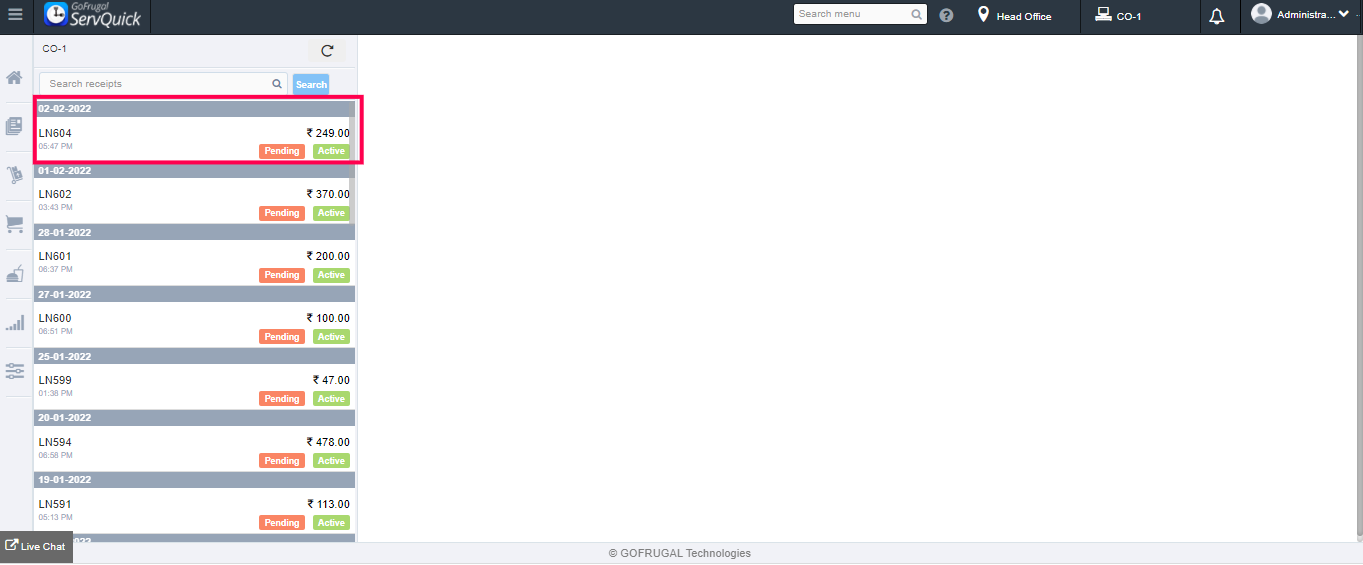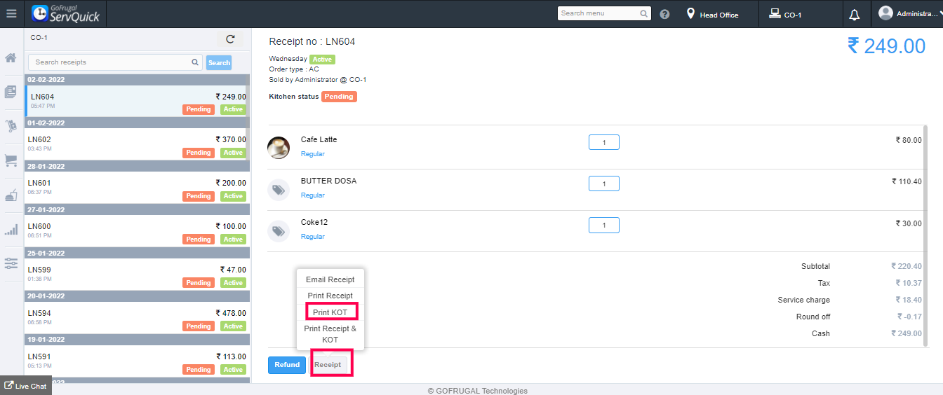 Open the receipt and click on the Receipt option. In receipts, click on Print KOT.