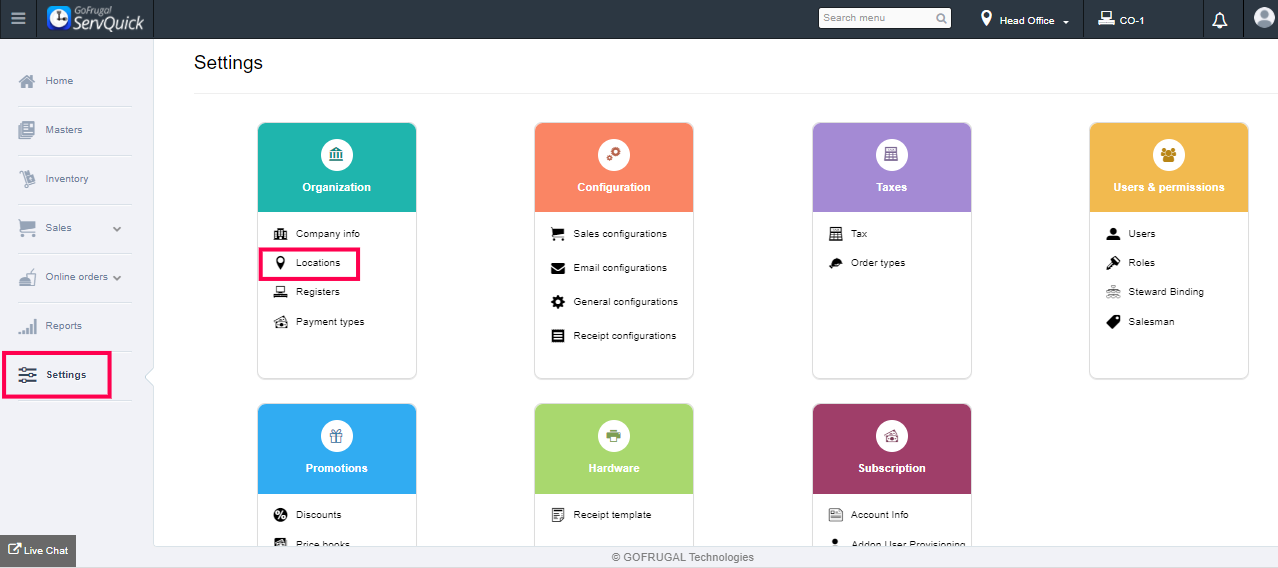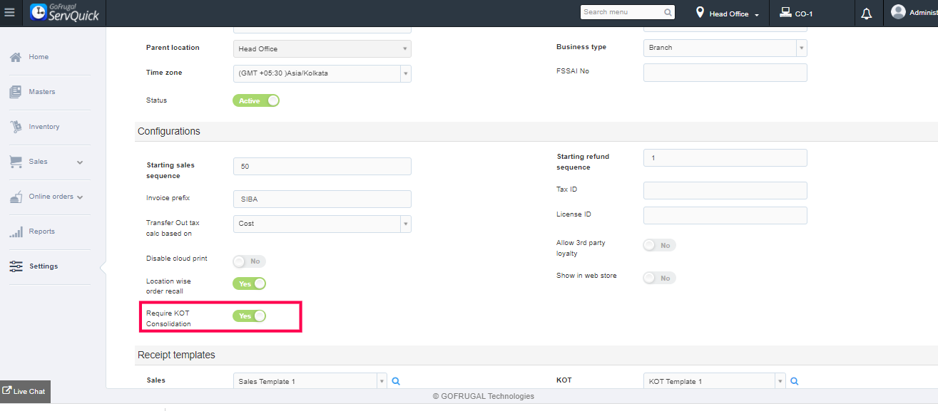 Before making a KOT Consolidated print, KOT Consolidation should be enabled for that location. To enable this, Go to Settings --> Organization --> Locations.