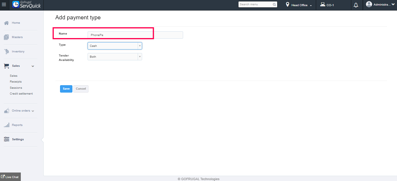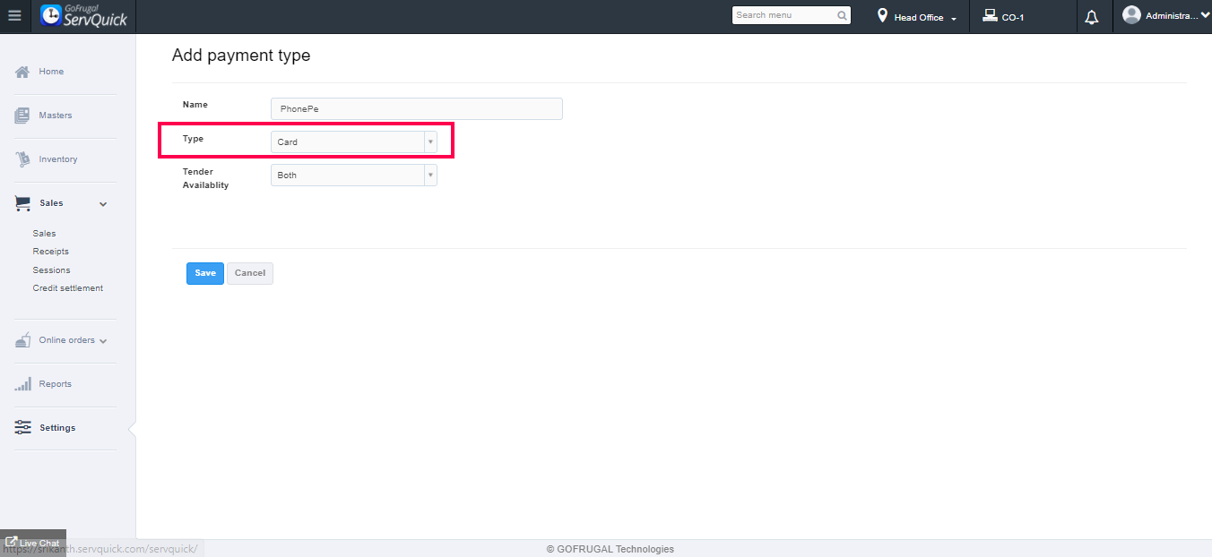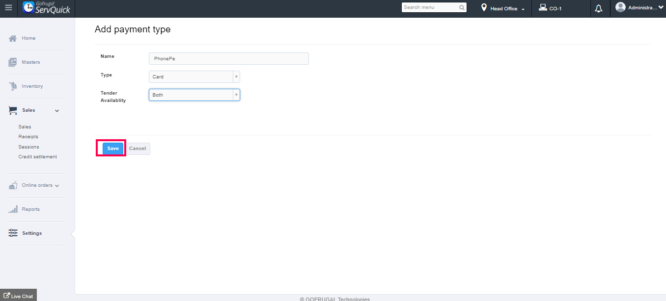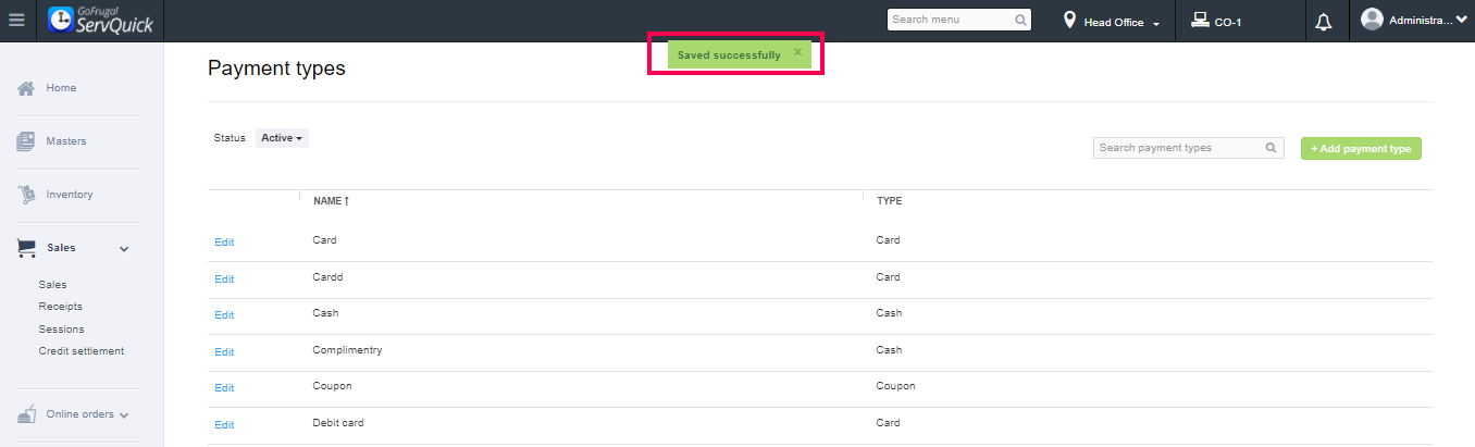 Now, the payment type has been saved successfully.