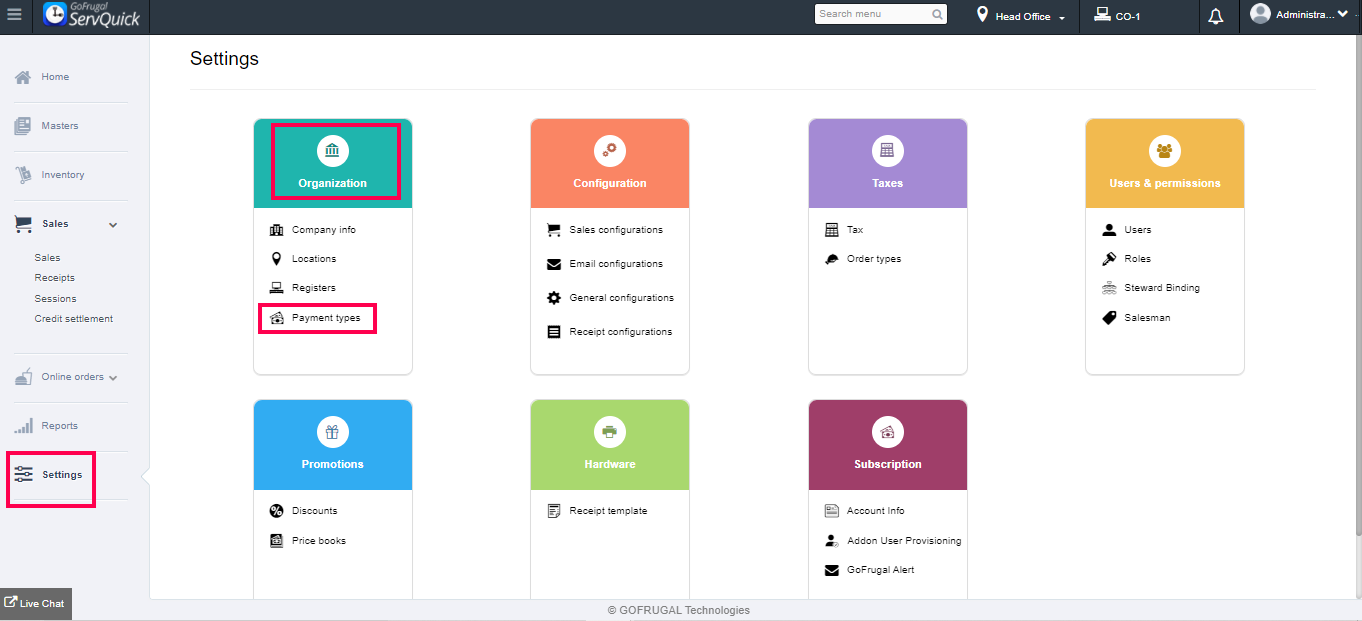 In the home screen, go to Settings --> Organization --> Payment Types.
