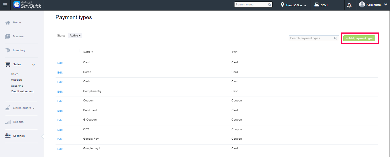 A list of existing payment modes will be displayed. For creating a new payment type, click on Add Payment Type.