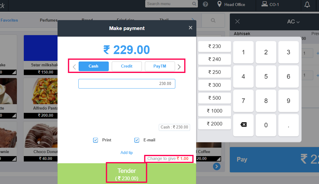 There are different payment modes as: Cash, Credit, PayTM, UPI, coupons, etc. Choose any of the payment options from the list and enter the amount. If the amount entered is greater than the bill amount, then the balance to be provided is mentioned on the screen. Click on the Tender to make payment.
