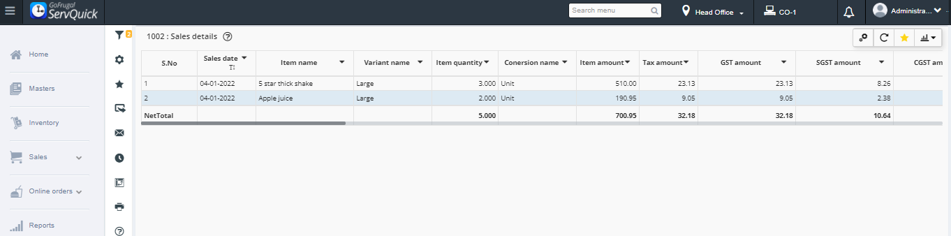 Now the sales bill has been created. This can be viewed in Reports--> Sales Summary--> Sales Summary/ Sales Details.