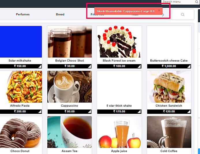 Note: There are chances of items going 'Out Of Stock'. In that case, you will receive an alert message while selecting the out of stock item.