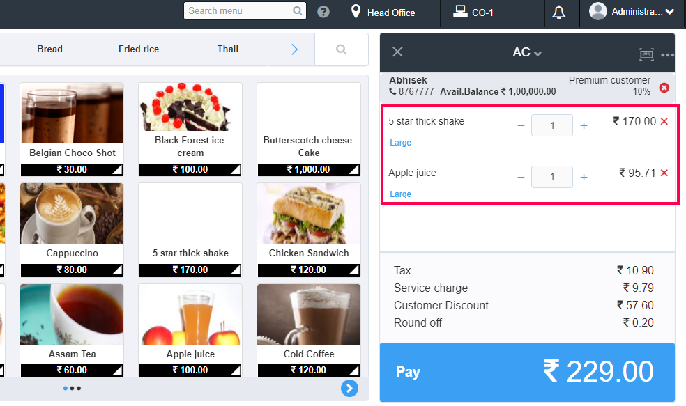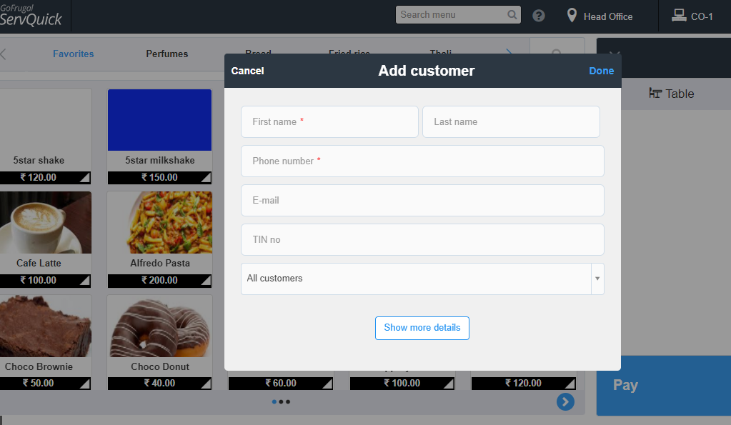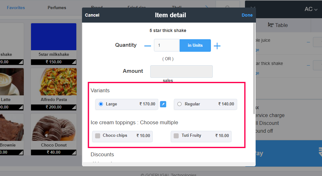 If the item has a modifier like toppings, hot or cold milk, sauce then you can choose that from the pop-up that is displayed while billing. You can choose the quantity, variants, toppings, discount value, type, and the reason for giving that discount.