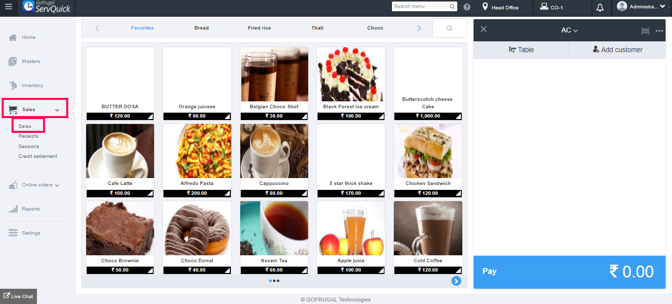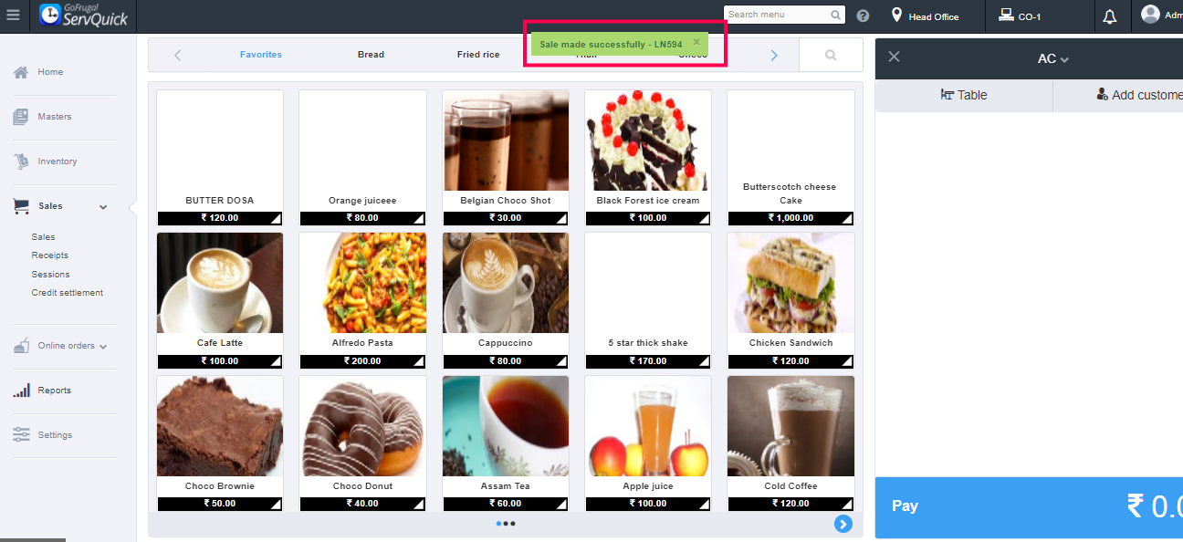 Click on the items to add them to the cart and click on Pay.