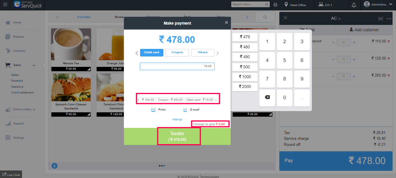 Similarly, select the different payment modes, enter their respective amounts for completing the transaction and click on Tender.