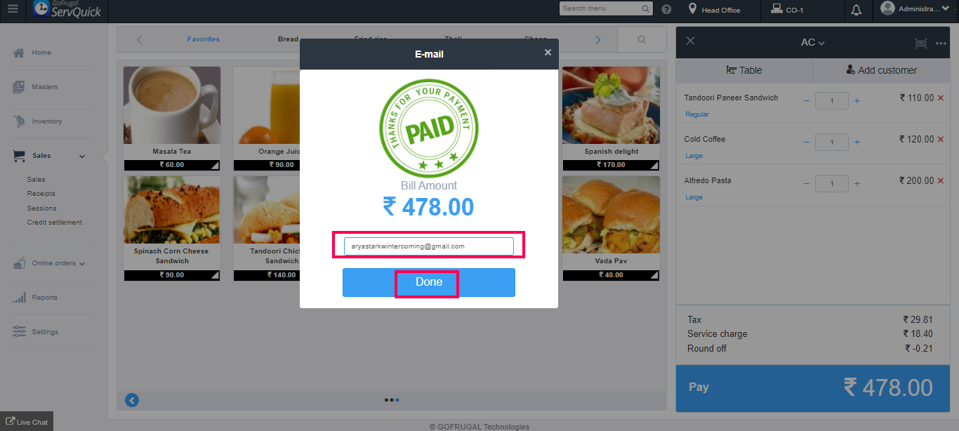 The payment has been made. Enter the mail id and click on Done to receive the payment receipt.
