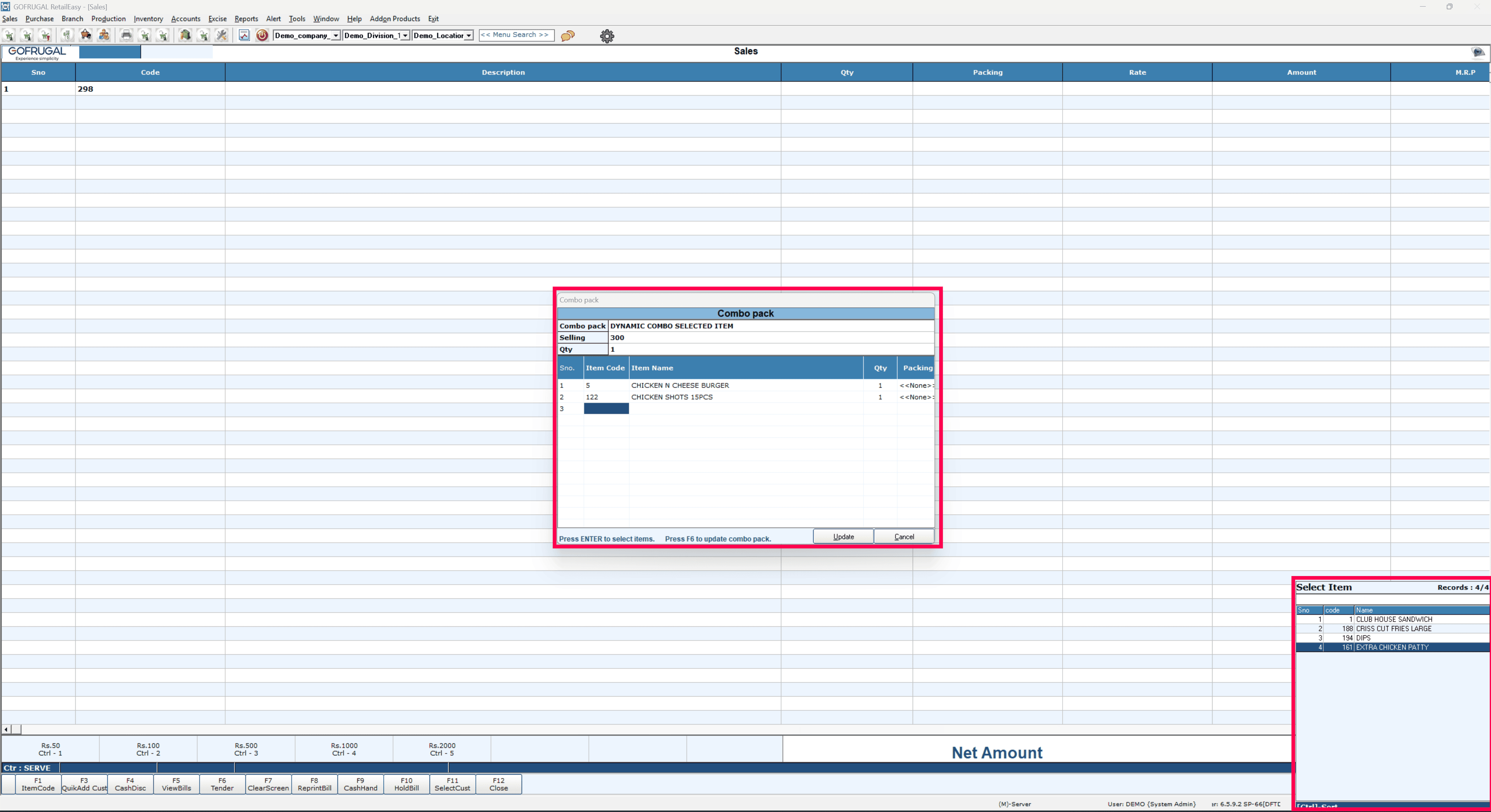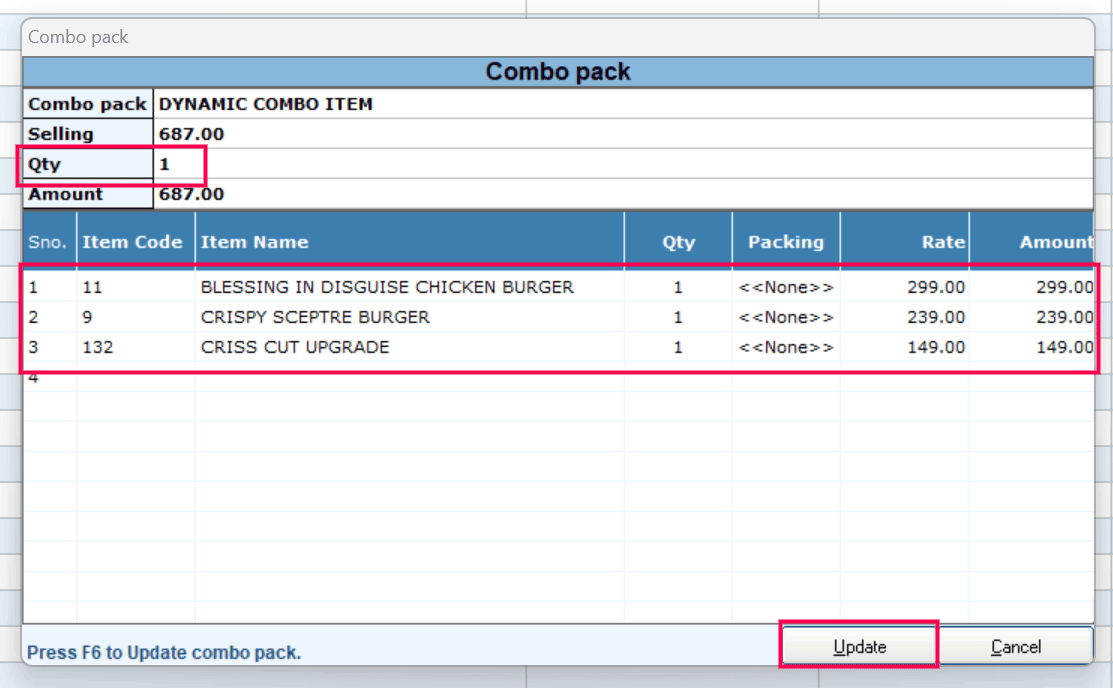 When you add a Dynamic Combo item to the bill, the Combo Pack selection window will appear, allowing you to choose the required items for the combo.