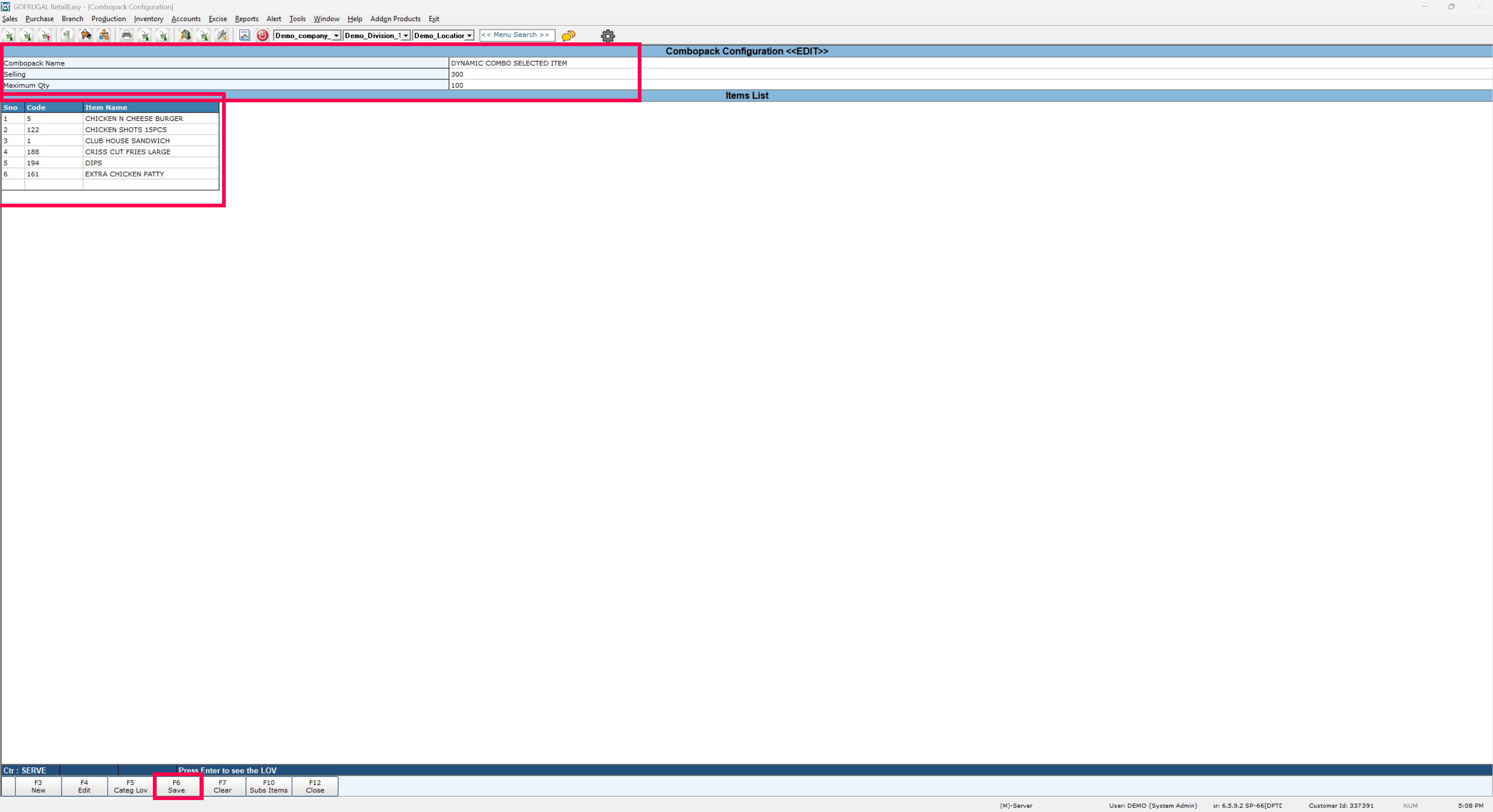 Select the Combo item, enter the selling price, specify the maximum quantity, and then add all the items that should be included in this Dynamic Combo item.