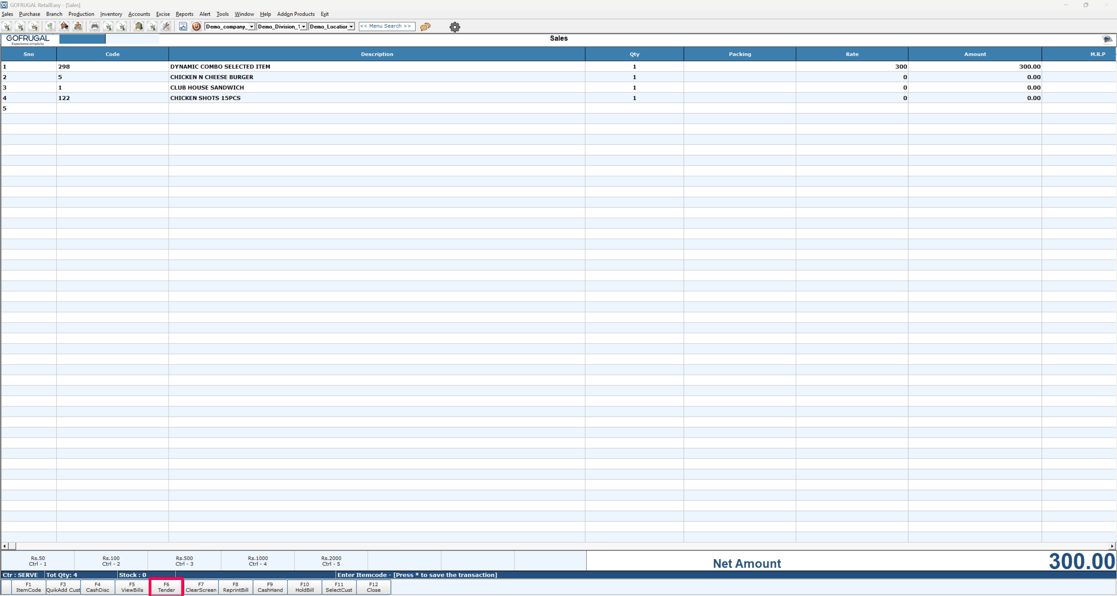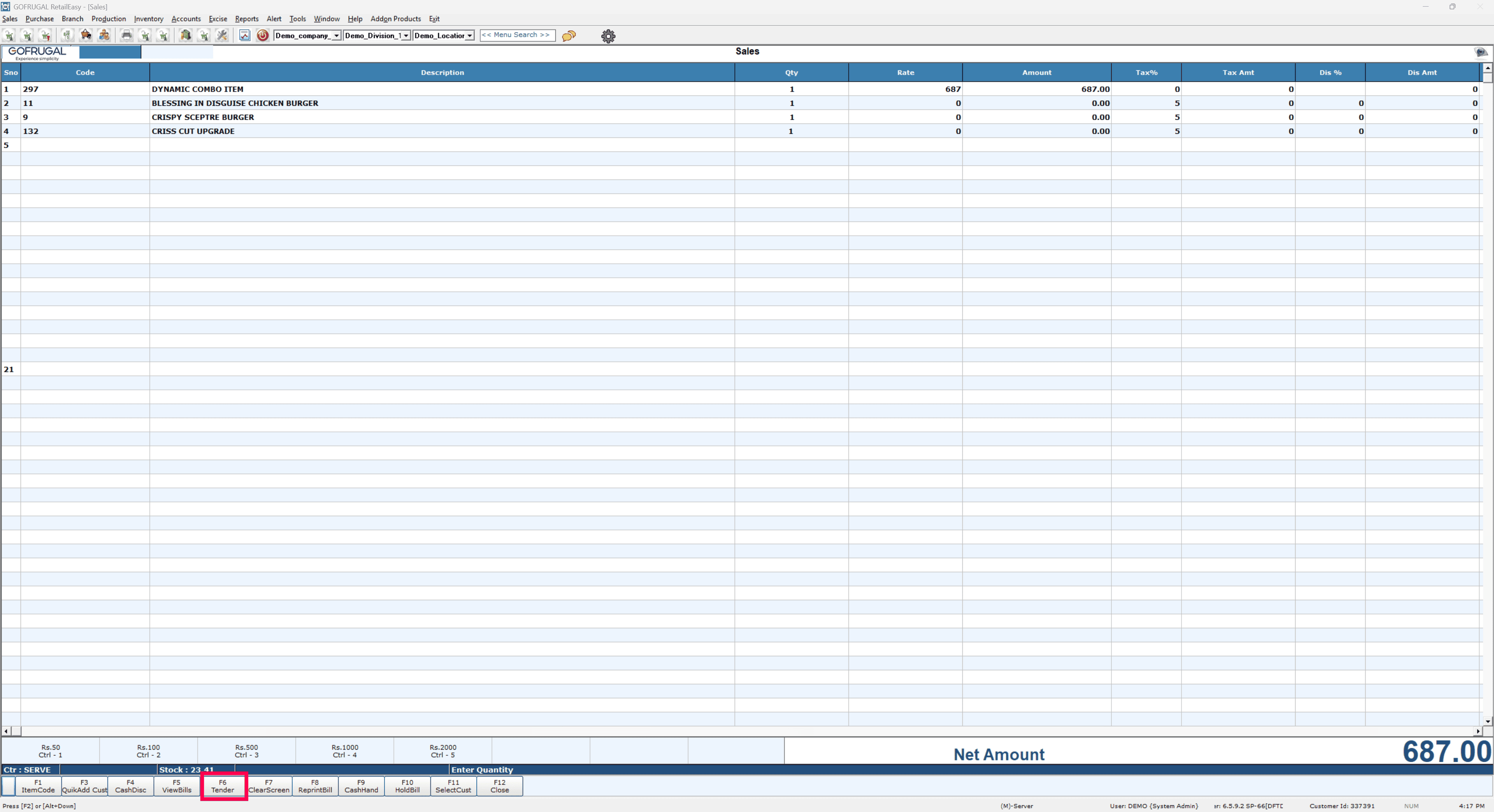 After all the items are loaded, press F6 (Tender) to save and complete the bill.