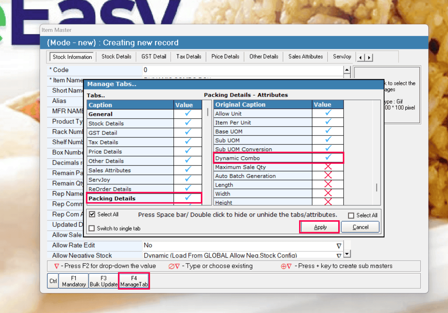 Activating Dynamic Combo from the Item Master - Manage Tab.