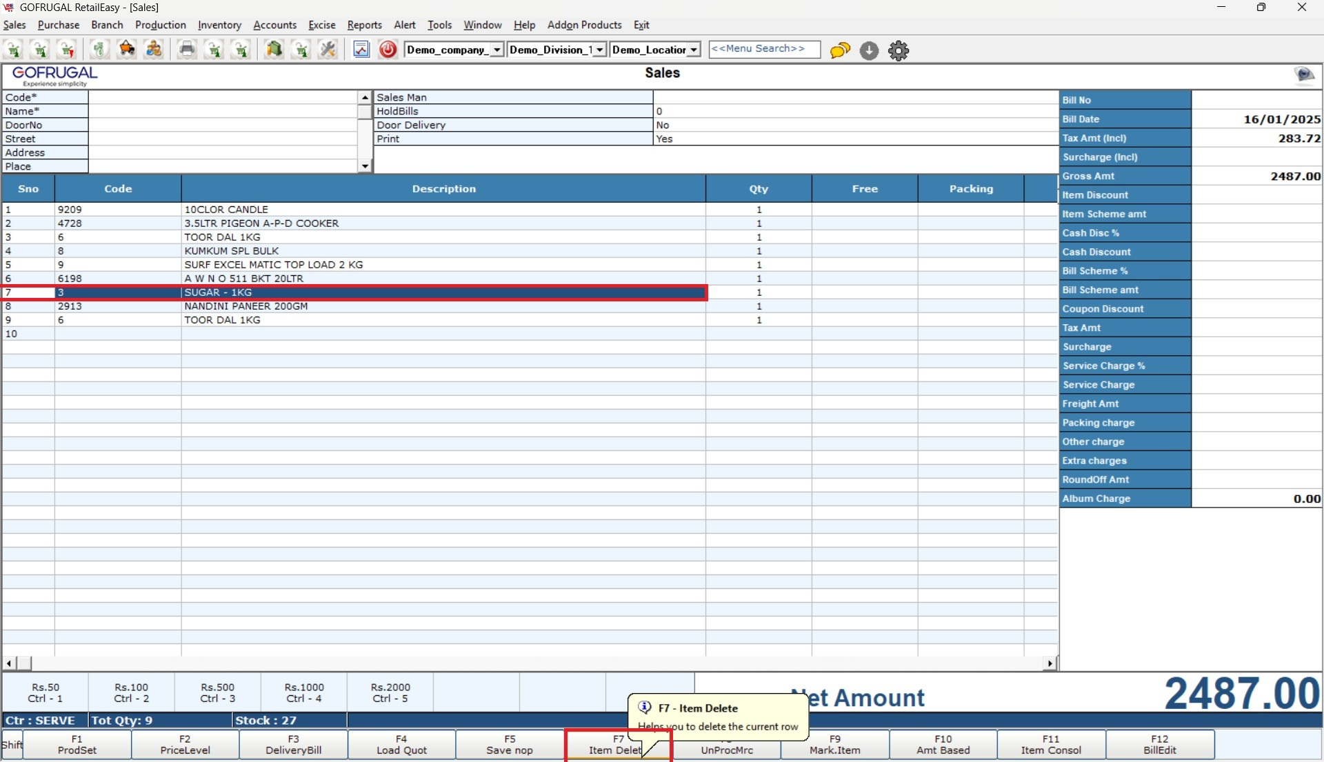 Quick Item Removal: The Item Delete function allows for easy removal of unwanted items from the bill during the sale process.