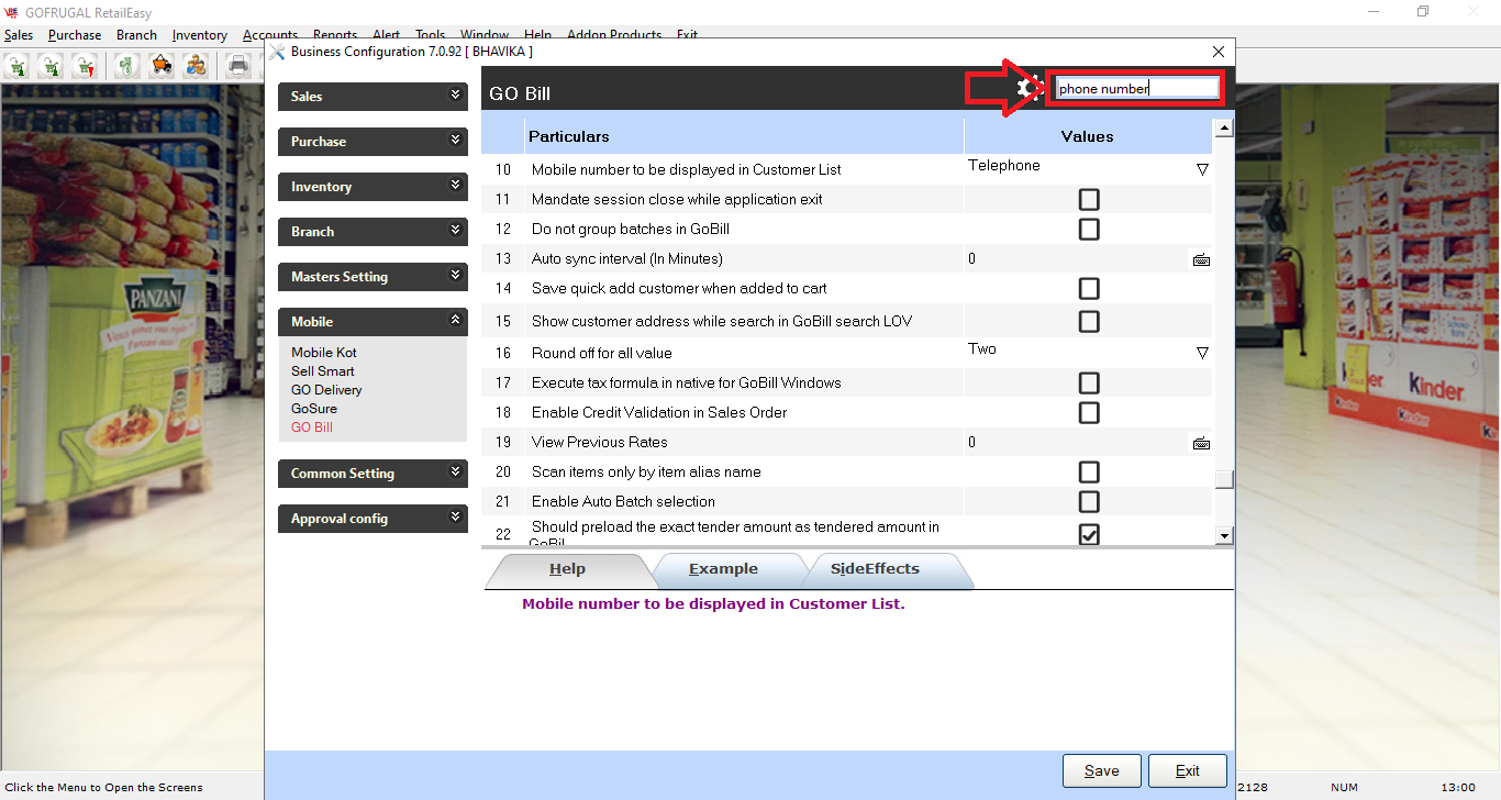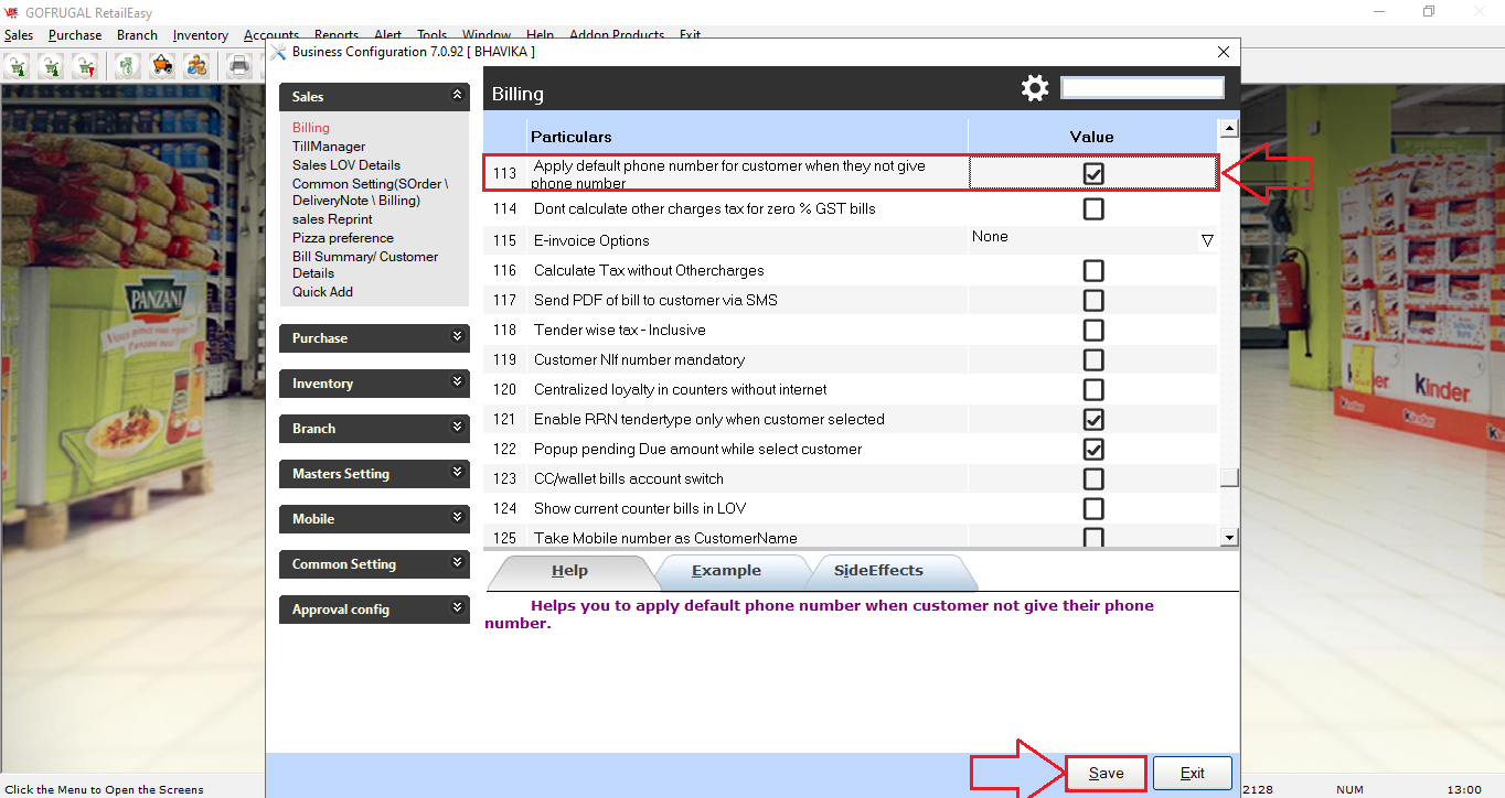 Step3: Now select the configuration 'Apply default phone number for customer when they not give phone number' & press 'Enter'.