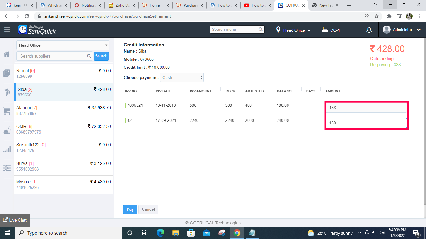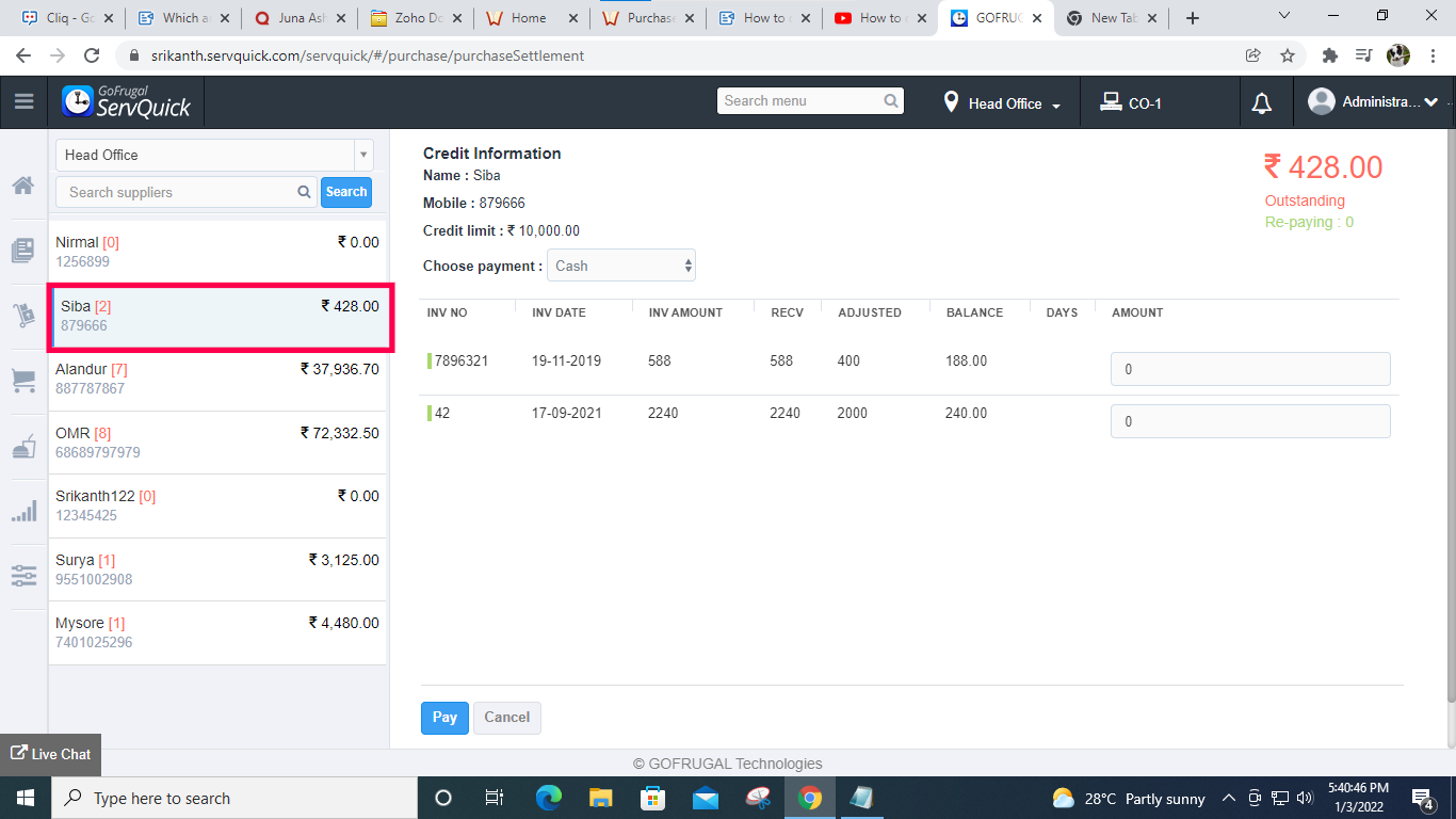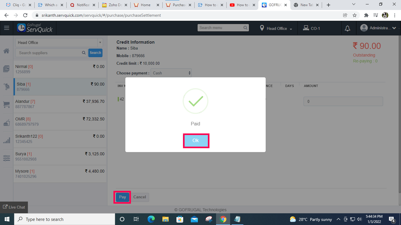 Note: You can perform settlement only when supplier payment mode is mapped as credit.
