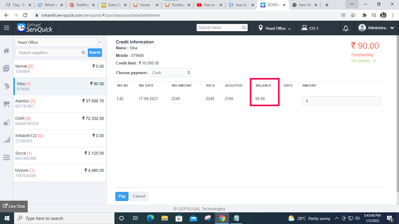 Now you can see that the partially settled bill is displayed with the balance amount in the Adjusted column. And the fully settled one is completely removed.