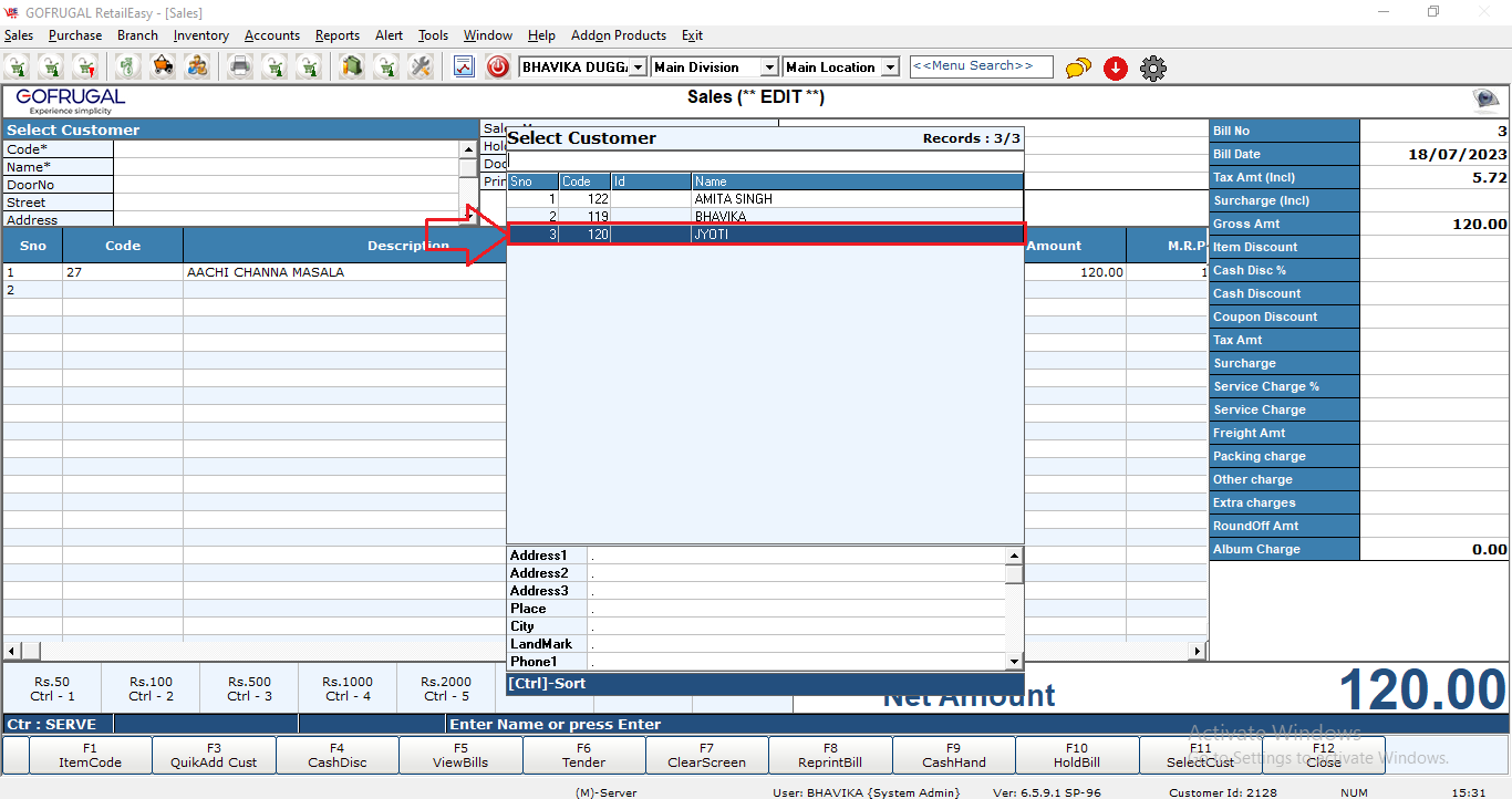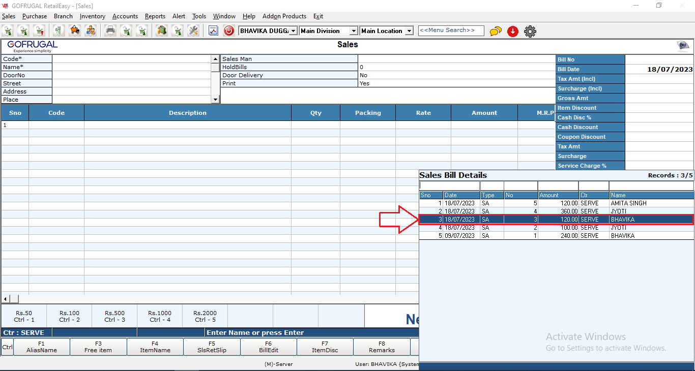 Step4: A 'Sales Bill Detail' window will appear where you will select the particular bill which has to be edited.