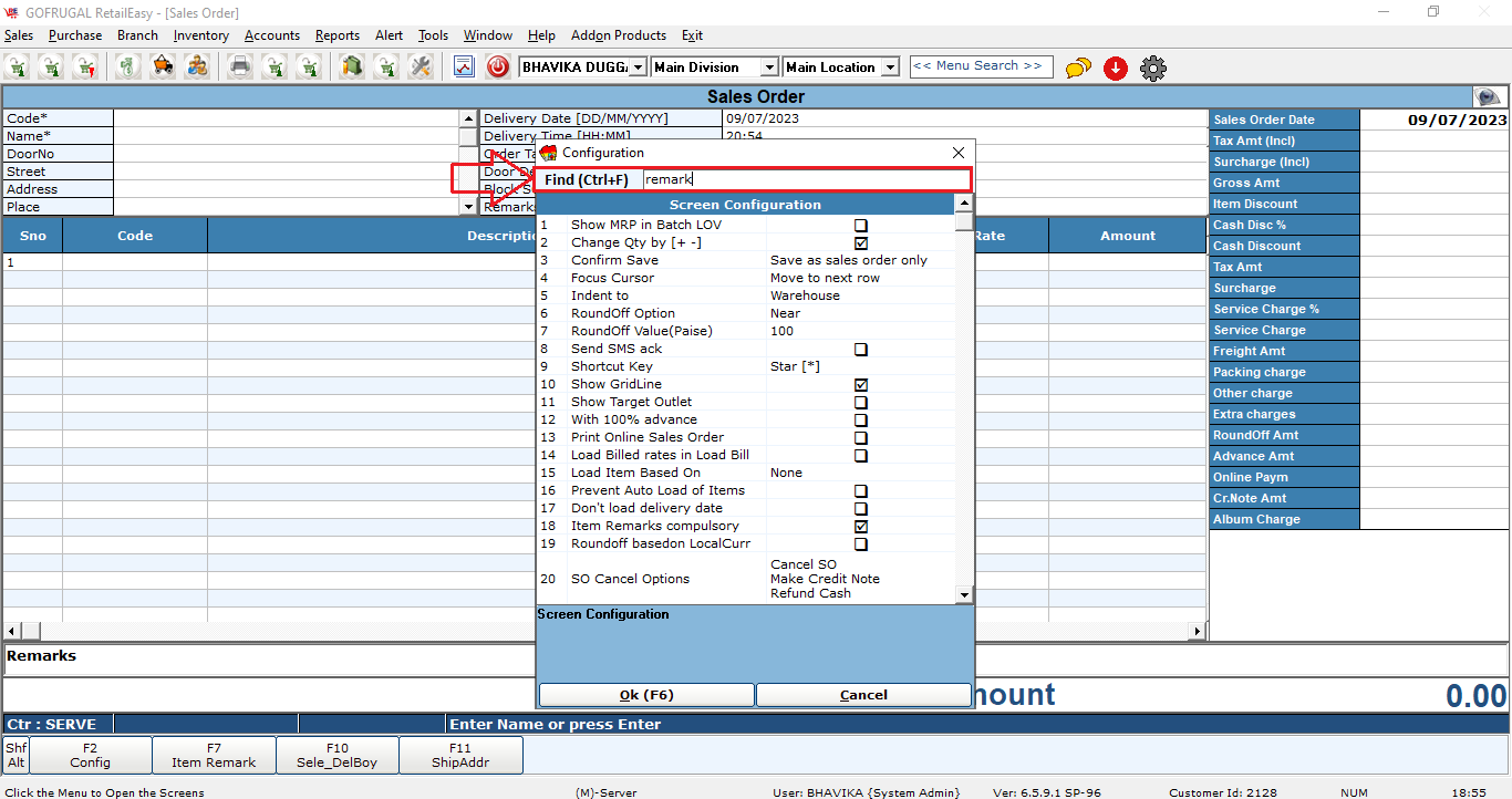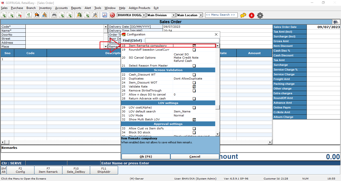 Step4: Select the configuration 'Item Remarks Compulsory' & place a check-mark beside it.
