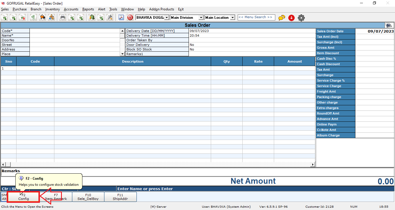 Step2: Click on the 'Config' tab on the Sale order entry screen.