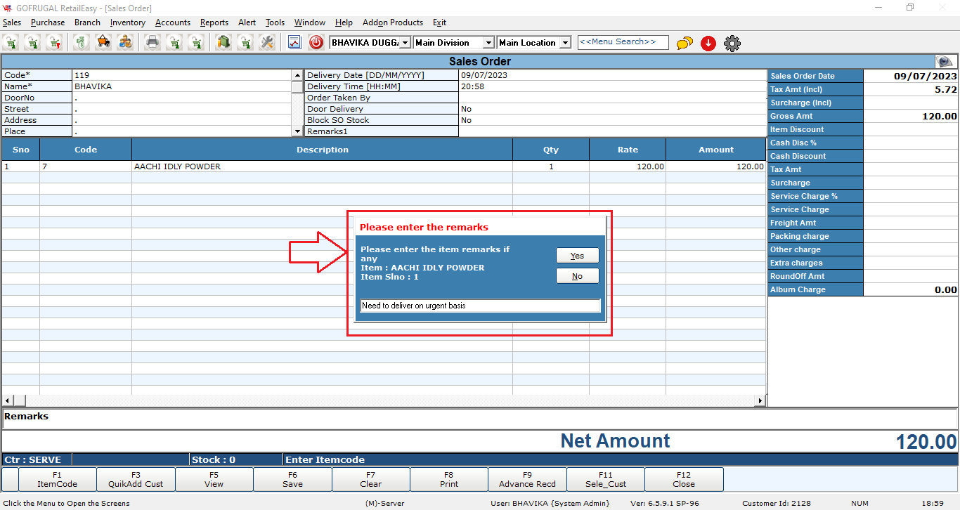 Step5: Now after mentioning all the details i.e. Item Name, Qty. You will get this window of 'Please enter the remarks' where you can easily mention your remark as per the requirement.