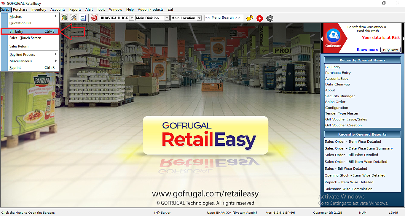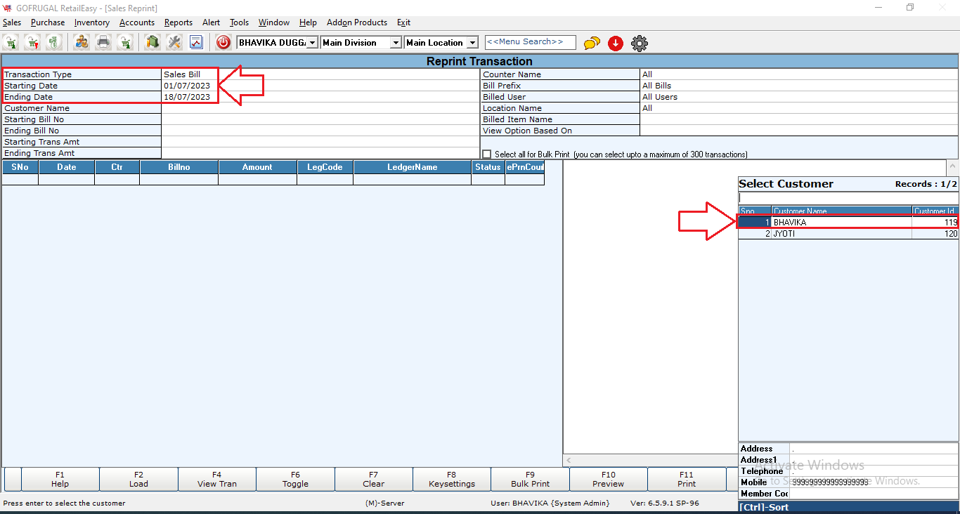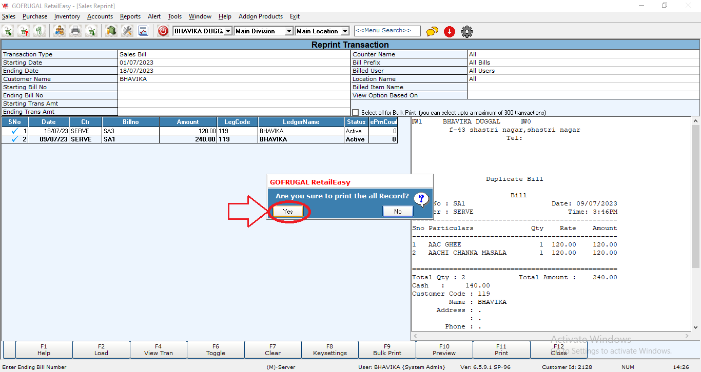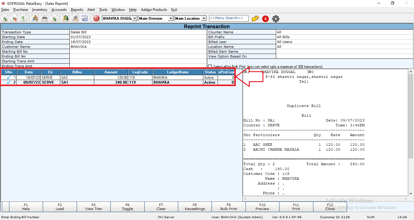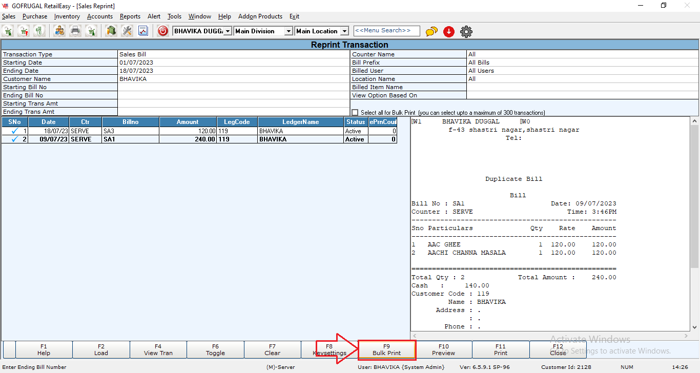 From Reprint Screen: By using this screen you can print single bill / multiple bills at one time and also the back dated bills