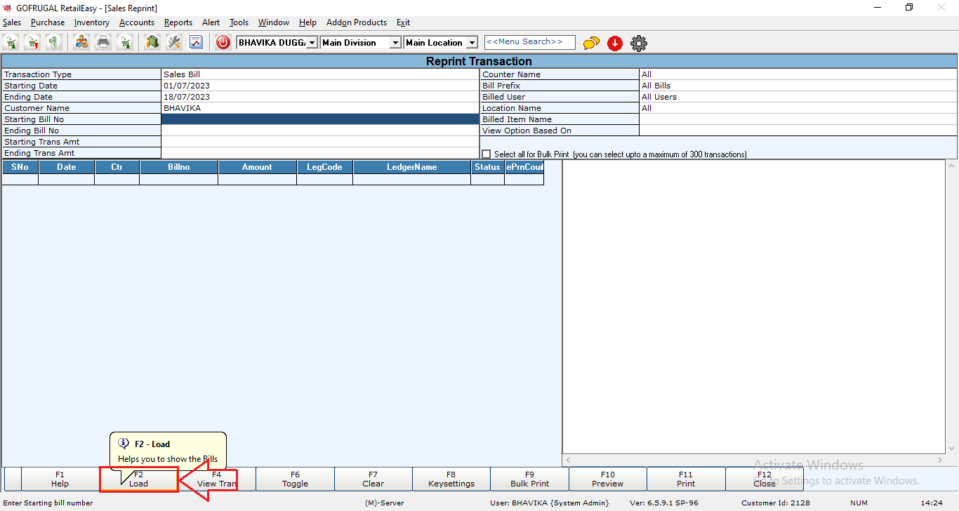 Step7: You can see all the sale transactions of the selected date range will get loaded where you press the 'Space Bar' key to select those bills which needs to be printed.