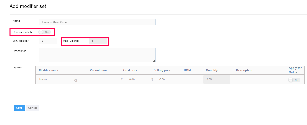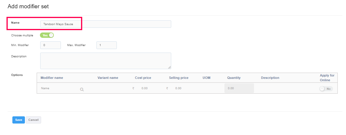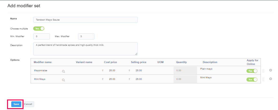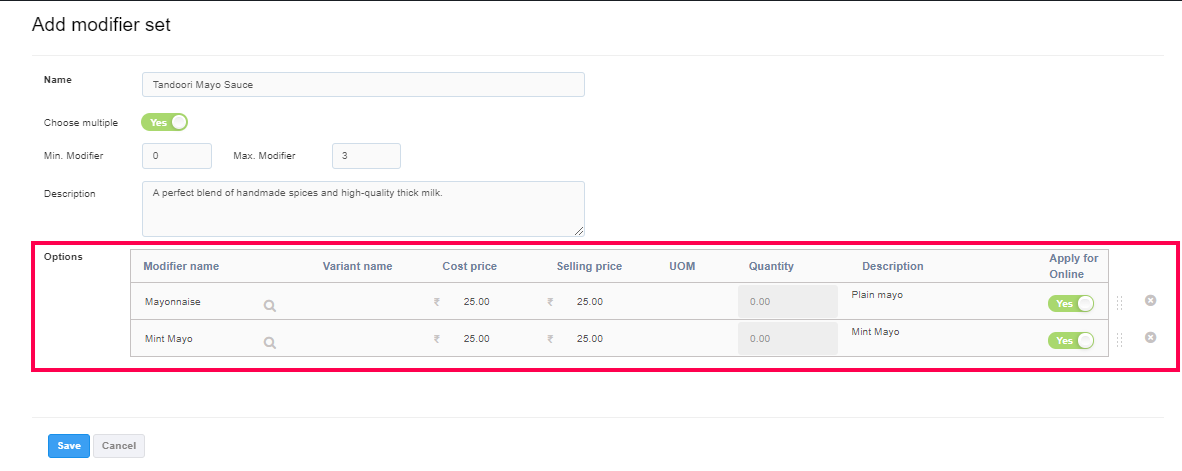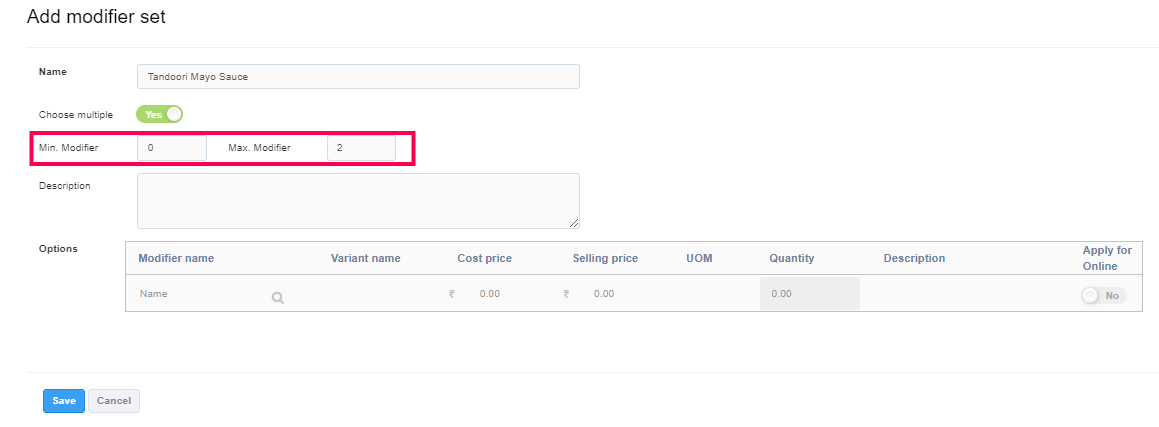 Add the different modifiers that you are going to add along with its cost price, selling price, apply for online and description.