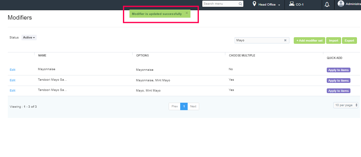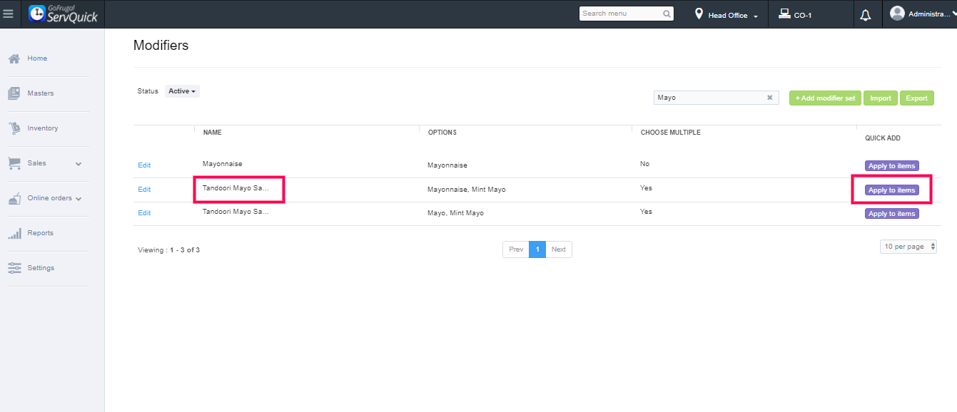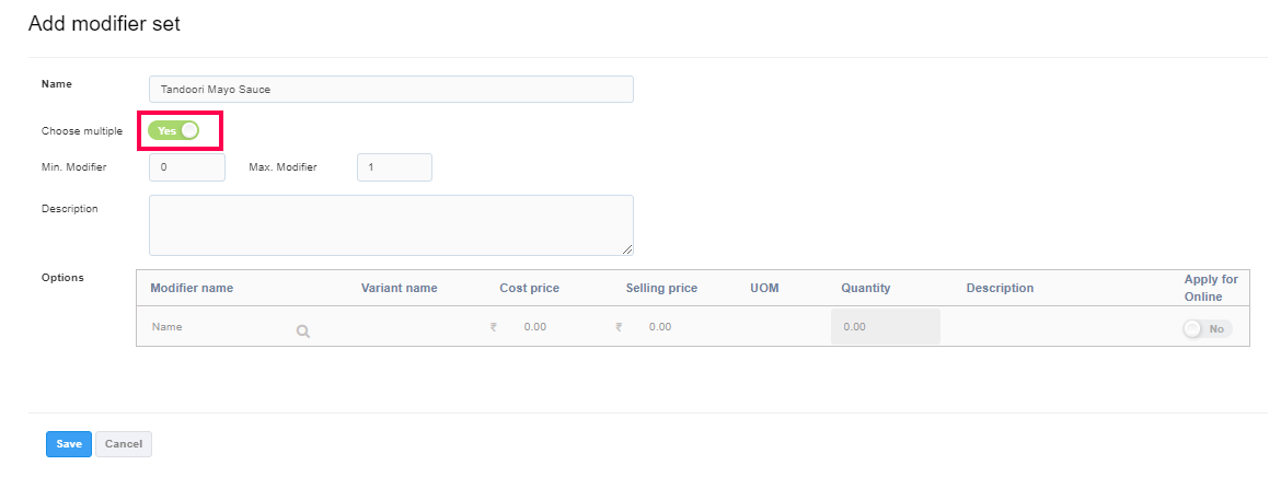 Note: Apply for Online option can be enabled, if the particular modifier is to be shown in the sales screen.