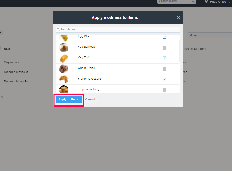 Choose the items for which you want to apply the modifiers to, and click on Apply to items.