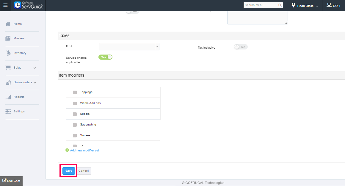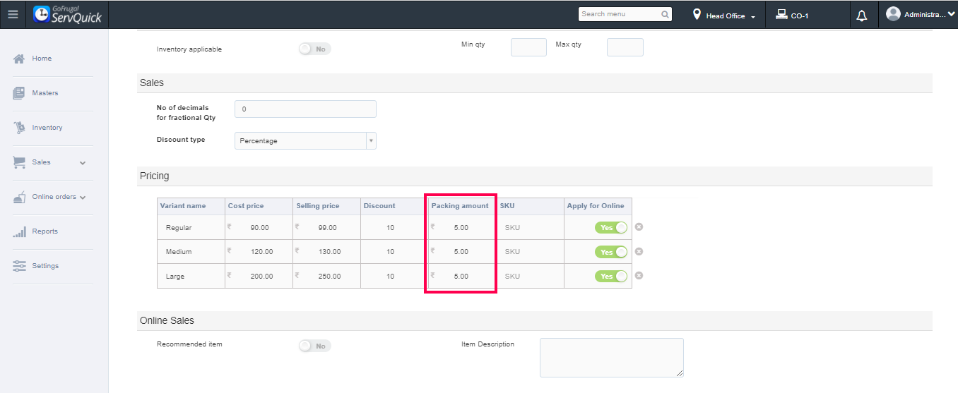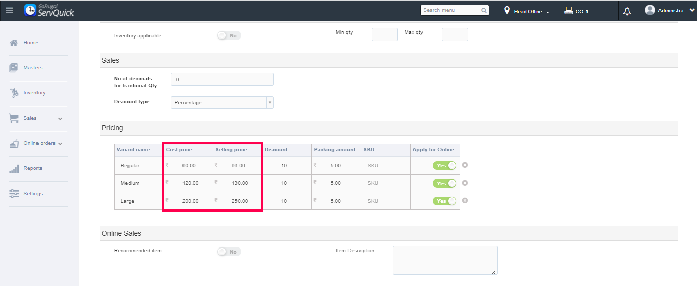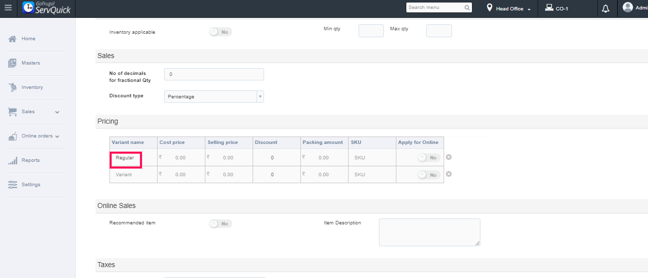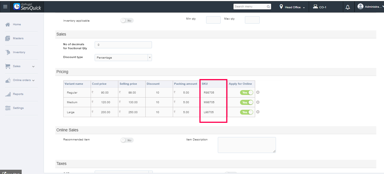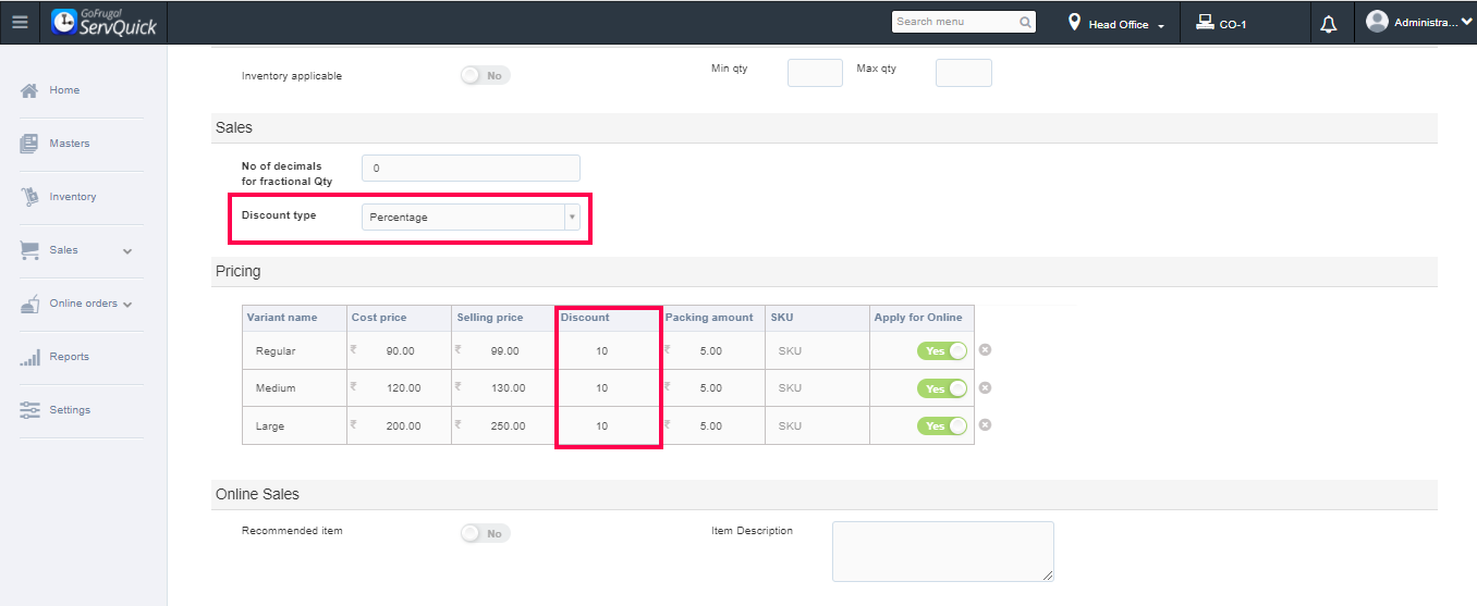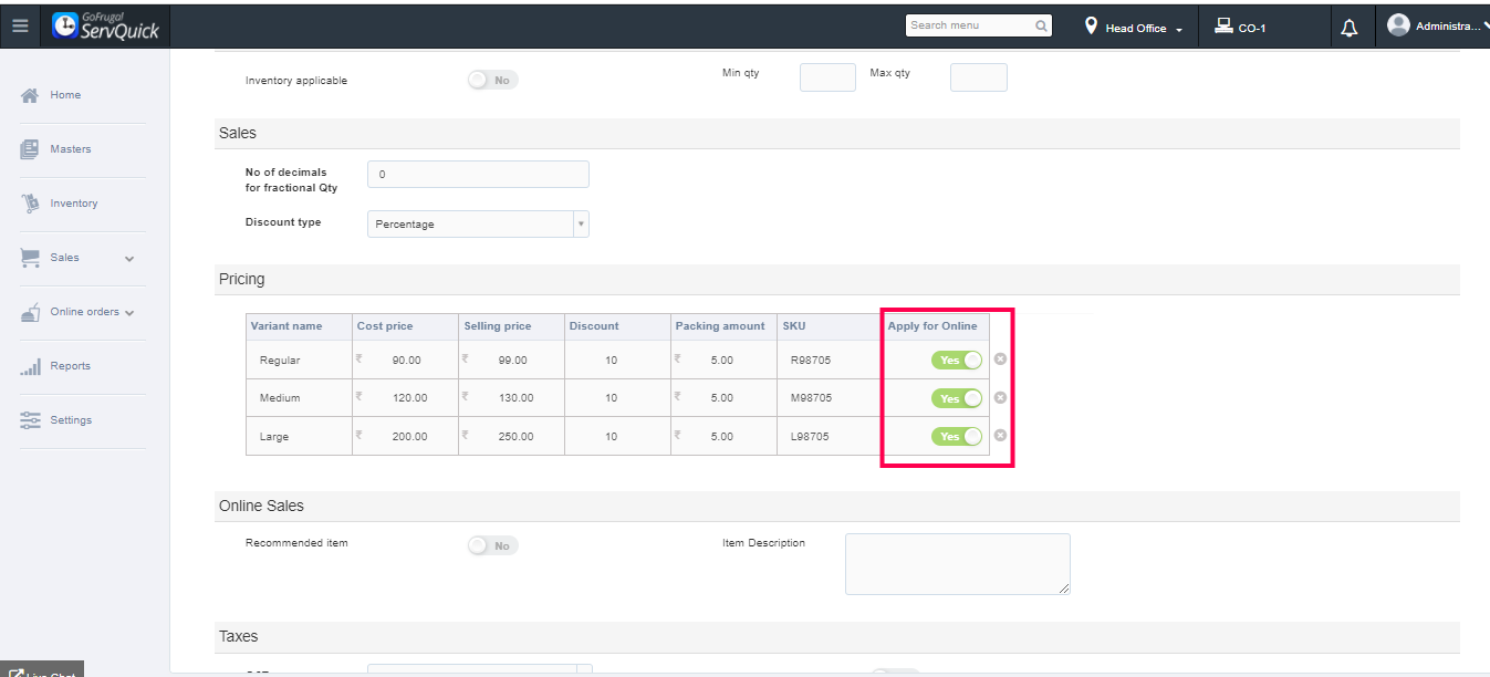 You can enable/disable the Apply for Online option based on your preference. If you want to display the variant type on the sales screen, then you can enable the Apply for Online option.