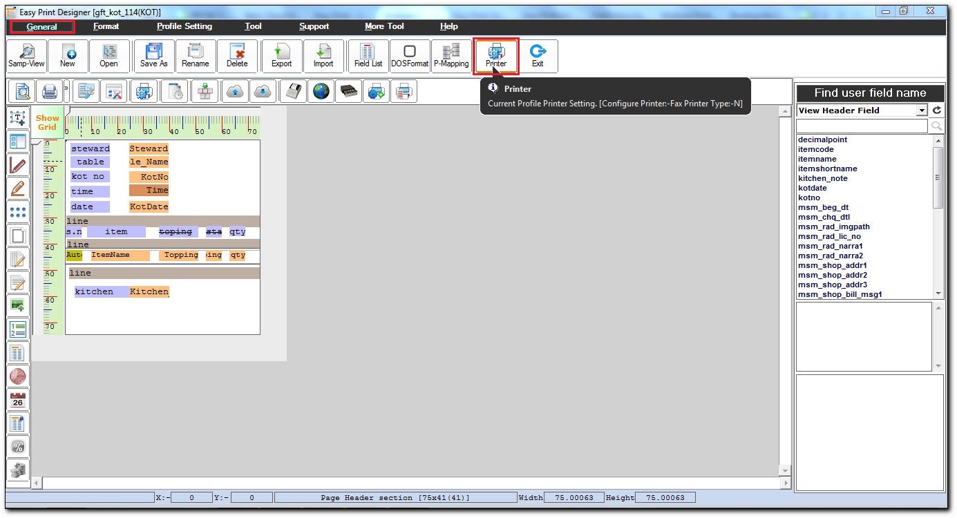 - Select the Kitchen Order taken (KOT) field, click Print Design.