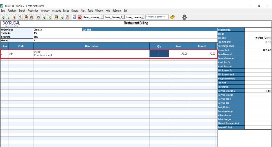As shown in the above Bill Entry screen you can see as the item is selected the price level is reflected and the price of chilli is increased by 10 accordingly