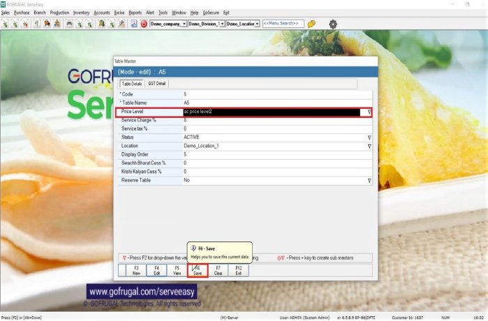5) Now while biling in Restaurant Bill Entry screen when you select the table A5 the price for selected item will be reflected according to mapped Price level as shown below