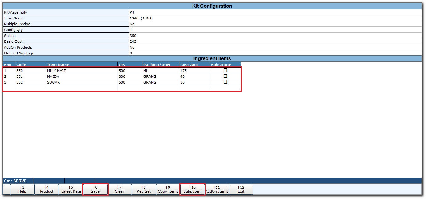 To make an item with substitute item, click Subs Items or press F10 key.