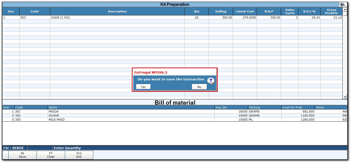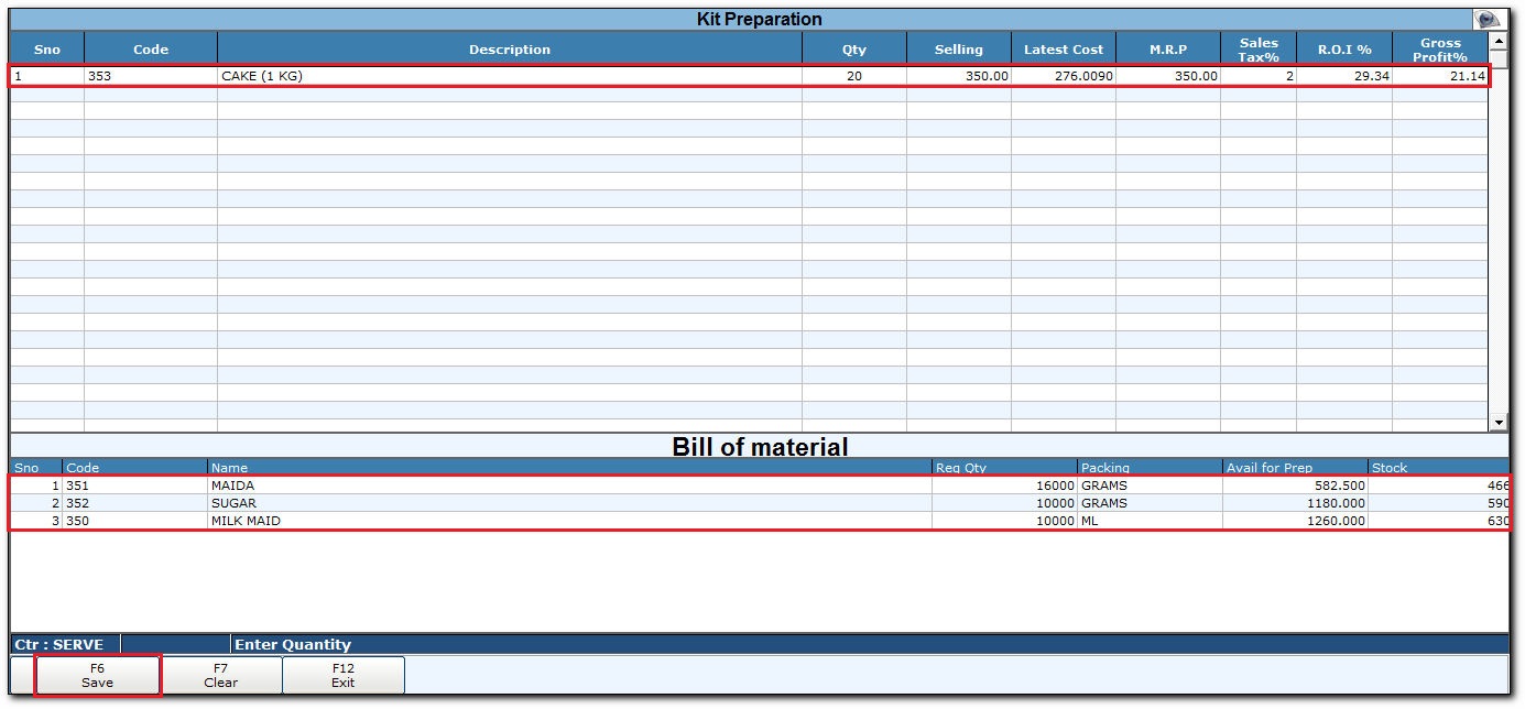 If in a restaurant or a bakery when shop owner decide to make 10 pc. of cake for next day so they can use KIT Preparation screen and check for 10 pc cake how much ingredients are available and if any additional is required or not.