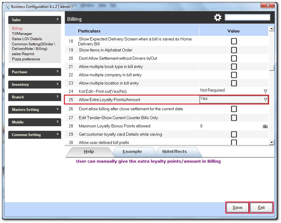 Use configuration Allow Customer Loyalty Points/Amount to give additional loyalty Points/Amount to the customer while billing the tender screen in Bill Entry.