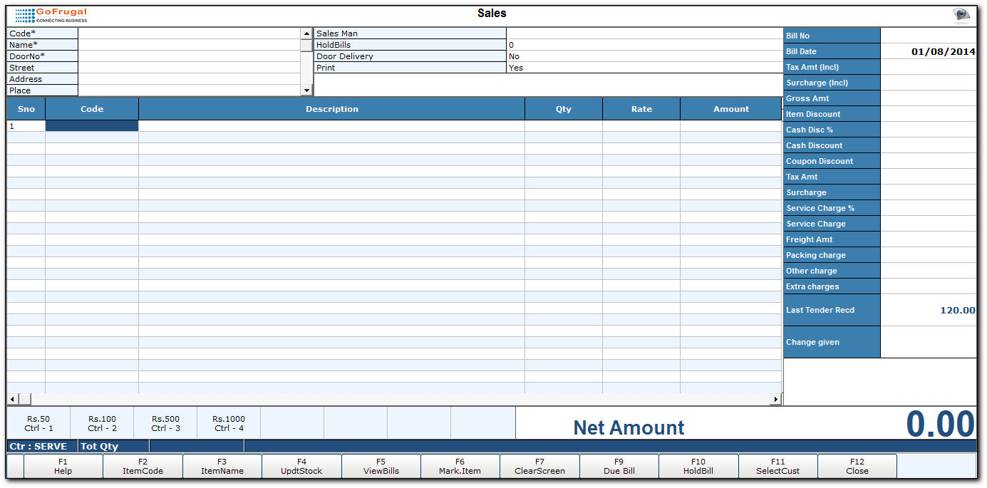 - The fields Sno, Code, Description, Qty, Rate, Amount display the details of the item.