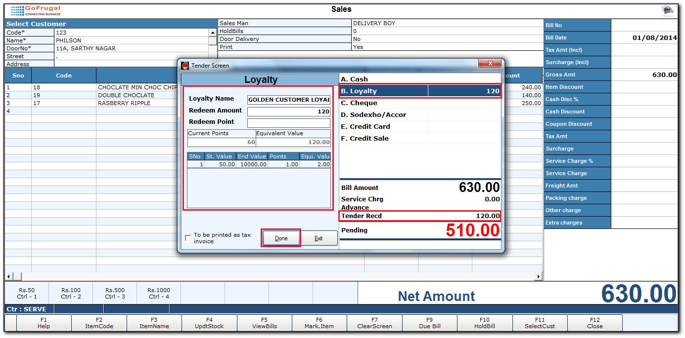 Note: The Redeem Amount value is automatically gets deduced from Bill Amount.